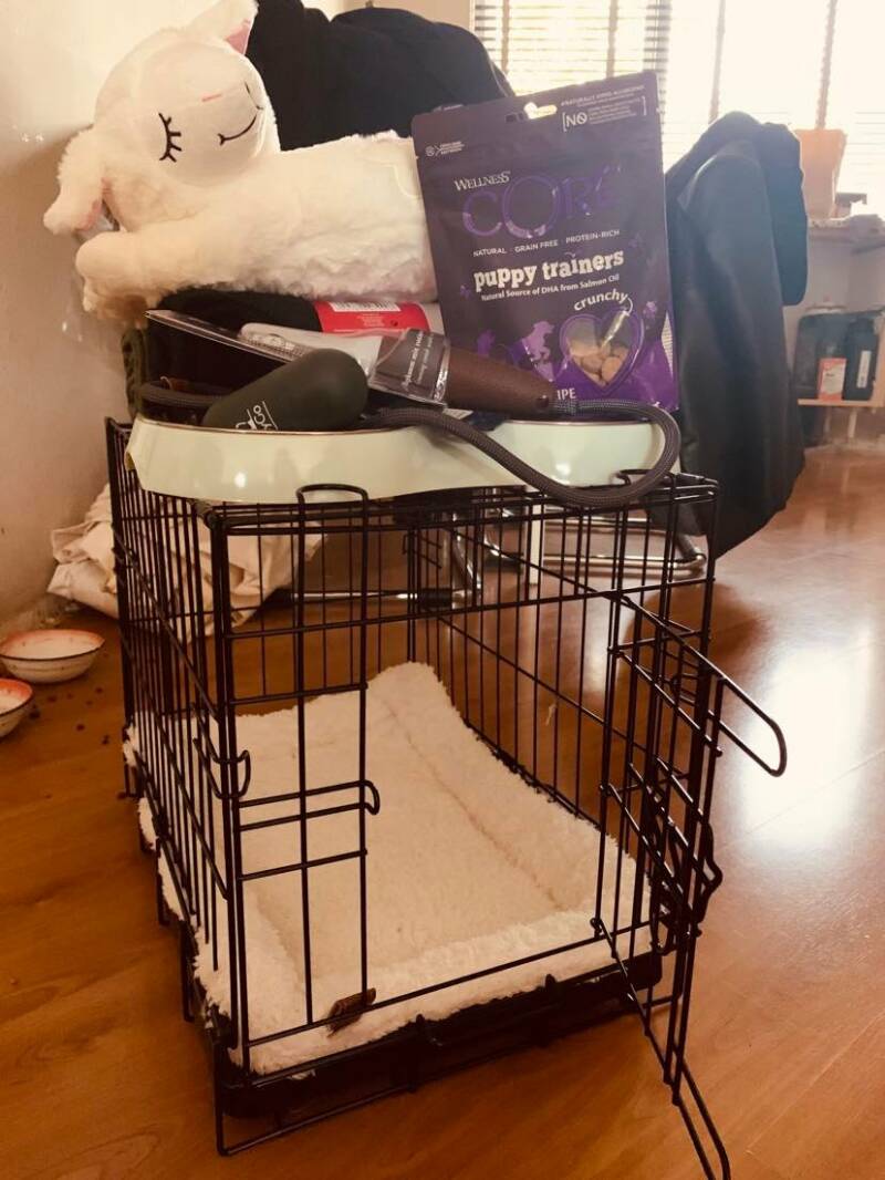 Ondertussen schaffen we een pup aan. Lekker handig ook als je huis op zijn kop staat. Het is verdomd moeilijk om een nest of toekomstig nest te vinden hebben we ervaren. Volgend jaar geen nesten kreeg ik keer op keer te horen. En van weer anderen kreeg ik niet eens een reactie. Tot ik een tip kreeg van wederom een nestloze fokker. Toen ik belde werd ik onderworpen aan een kleine inquisitie. Uiteindelijk zei de fokker, 'ik heb er twee beschikbaar en die zijn al 6 en 7 weken. Bovendien zijn dit voorlopig de laatste nestjes die ik krijg dus het is nu of over 1,5 jaar. Na het familieberaad van ongeveer eén minuut besloten we dat het nu moest worden. En zo ging het balletje rollen. Ik heb nog aan de fokker gevraagd of die verbouwing geen probleem zal vormen voor de hondenbaby. Denkend aan onrust en veel toekomstig getimmer en gehamer. Maar zij verzekerde mij dat ze haar puppy's heeft blootgesteld aan veel prikkels dus daar moet ze tegen kunnen. Dus togen wij met de hele bubs naar het platteland om onze pup te gaan bekijken en gezamenlijk volledig in katzwijm te vallen. En nu zitten we al een hele lange lange week op een roze wolk te wachten tot we haar mogen ophalen. Onze Saartje. Ik ben een beetje los gegaan met puppyspullen shoppen en alles staat klaar voor onze nieuwe kleine vriendin. Het is een iniemini hondje, dus een iniemini bench-je. Te grappig.