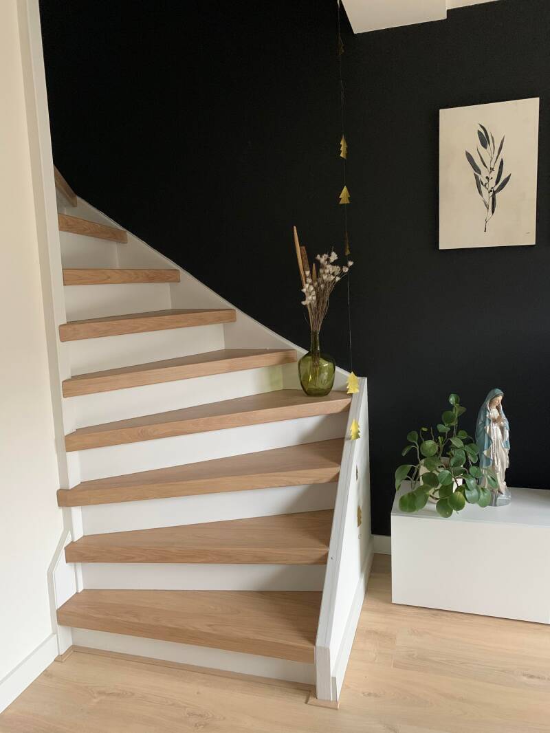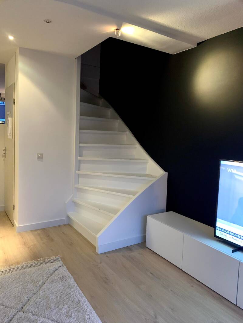 En dan de trap. Ik krijg veel te veel trap-materiaal binnen. De bekleder schud zijn hoofd. Hij gaat kijken of hij de juiste maten heeft gekregen. Tegenwoordig zit het opmeten niet meer bij de service. ik kreeg een mail of ik dat zelf even wilde doen. Daar zit nog een heel verhaal aan vast want dat klinkt makkelijker dan je denkt. Maar lang verhaal kort, ik heb bij eén trede niet de juiste maat doorgeven en dus is er ondanks al het teveel geleverde spul toch tekort. Snap jij het nog? Ik roep dat ze het dan niet aan een leek moeten overlaten om zulke precieze maten op te laten meten. voor hun een kleine moeite toch? De bekleder is het met me eens. Hij maakt er een pracht trap van maar ergens bovenaan moet dus nog steeds een trede worden gedaan. De afspraak is al drie keer verzet. pfff