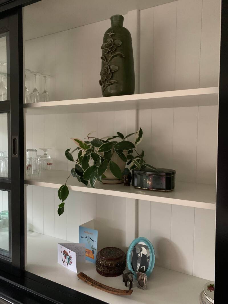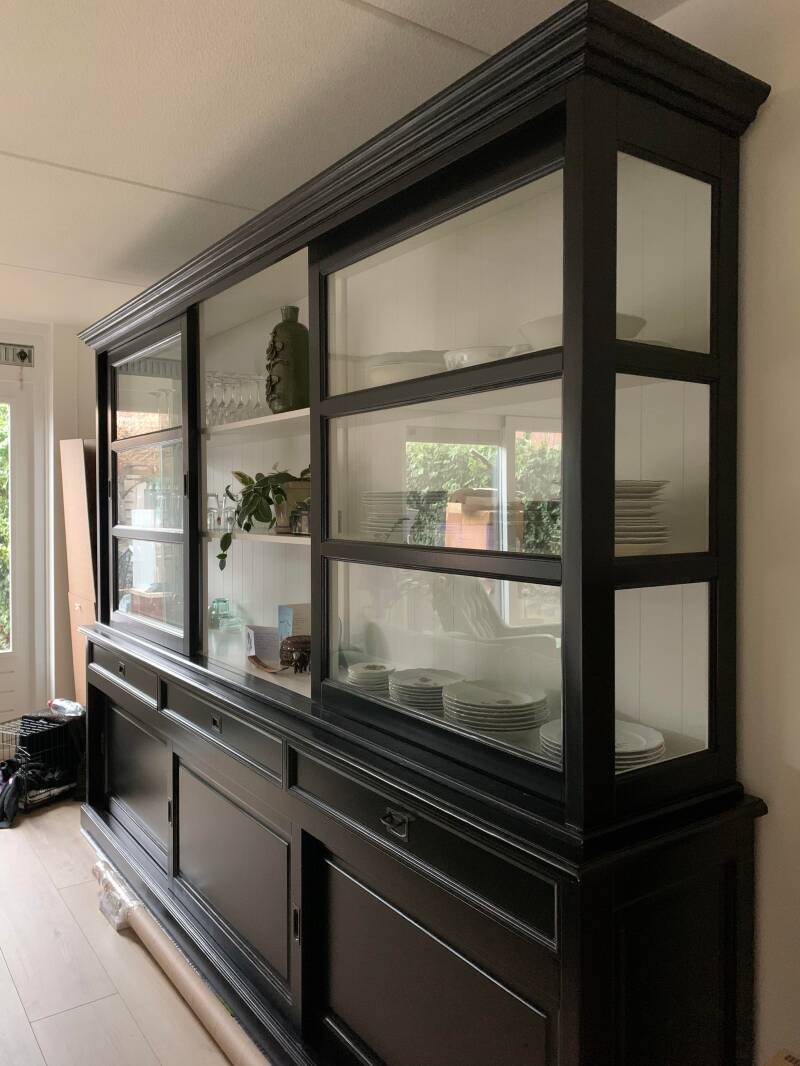 De kast... Ik was dus aan het schilderen weet je nog? Toen ik hem eindelijk af had moest de kast verplaatst worden omdat de vloer gelegd moest worden. Met de sterke armen van Herman erbij werd het bovenste gedeelte van de kast opgetild. En toen... kwam alle verf mee! Weer een heel stuk verf van die kast af. En toen was ik er klaar mee. 'Weg met die kolere kast' riep ik uit. Inmiddels heb ik een compromis gevonden. Hij gaat naar mijn atelier. Dan heb ik voldoende opbergruimte en kunnen de andere kasten daar weg en hoef ik toch niet helemaal afstand te doen. Maar er moest wel een andere komen. Na zoeken, bellen en mailen vond ik deze, drie meter breed en fantastisch als zeg ik het zelf. Bovendien lopen de deurtjes en laatjes als een tiet en past al mijn servies en glaswerk er in en kan ik ook nog een beetje mijn deco dingetje doen.