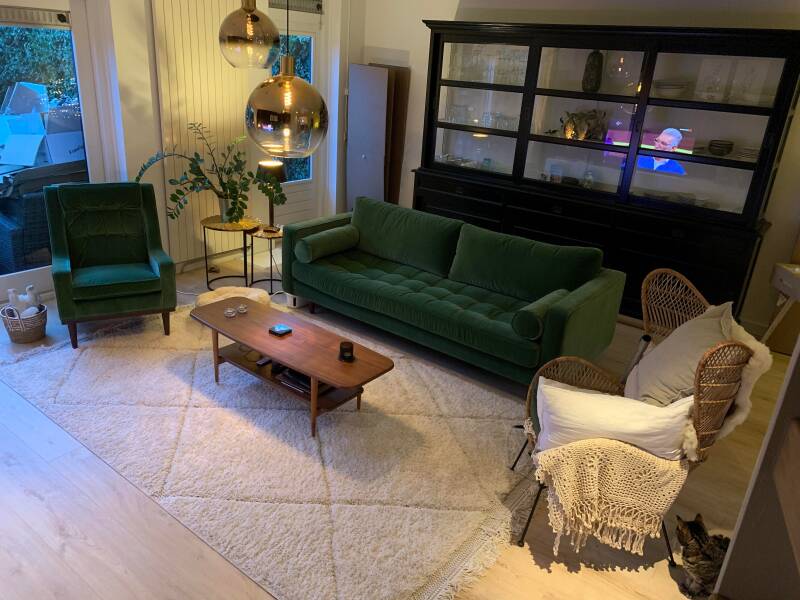 Ik wilde eigenlijk wachten tot alles helemaal klaar zou zijn, maar joh dan kunnen we wachten tot sint juttemis. Gisteren gebeld of mijn koelkast en afzuigkap al een keer gearriveerd waren. Ik zou terug gebeld worden. Njet. Zo langzamerhand begin ik er aan gewend te raken... Maar hierbij dus de foto's van onze huis-transformatie! Ik had het allemaal in mijn hoofd maar je moet altijd maar afwachten hoe het er in het echt uit gaat zien. Ik heb verschillende stijlen gemixt maar het is naar mijn idee toch een geheel geworden. Van mijn retro salontafel tot landelijke buffetkast naar strakke tv kast en luxe Meiland tafeltjes en boho rotan stoel. De groene bank moest het geheel helemaal boosten en afmaken en potverdikkeme dat doet hij met glorie! De gordijnen laten nog op zich wachten tot eind Januari. Dat zal de kers op de taart gaan worden en het nog gezelliger maken.