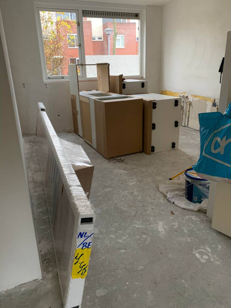 En als ik tussen de bergen troep heen kijk zie ik een heuse keuken ontstaan!