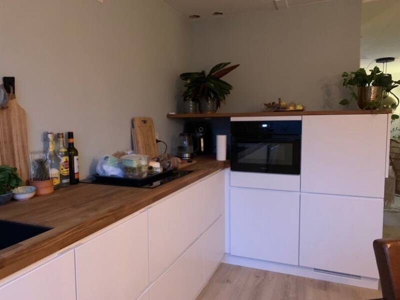 Er was vier man voor nodig om het zware houten aanrechtblad op de keuken te tillen, maar dan heb je wel wat!