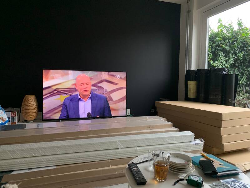 De vloer ligt inmiddels ook klaar en goddank hebben ze een andere legger weten te vinden om het te plaatsen. De jongen komt op Zaterdagochtend vroeg uit Den Haag rijden. Wij verplaatsen ons naar de keuken zodat hij de ruimte heeft. Hij vraagt of hij zijn eigen muziek aan mag zetten en zodra de knop aan gaat begint er een Surinaams feestje in ons huis. Te grappig en gezellig. Ik voer hem koffie, cola, roze koeken en tosti's en hij werkt keihard door. Tot 22:00 uur 'avonds! Die lieverd heeft ook nog alle plinten gedaan. Waar wij hem zeer dankbaar voor waren want anders hadden we die tot op vandaag nog steeds niet gehad.