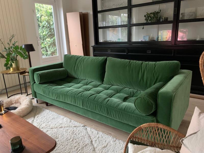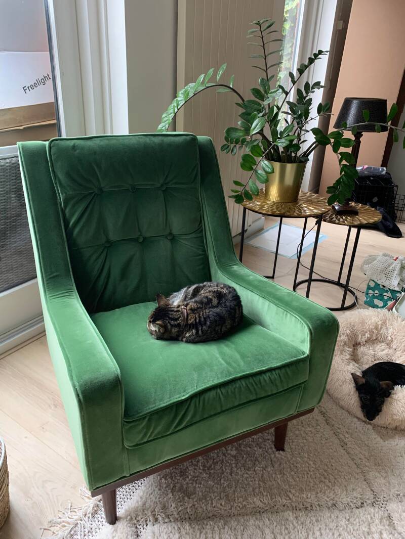 En dan de bank! En de stoel natuurlijk. Deze kwamen eerder dan verwacht. Ook wel eens leuk! Ze maken het plaatje af en iedereen die schrok toen ik zei dat hij groener dan groen zou zijn en zich kapot schrok, is er toch van teruggekomen. Hé, trust me!