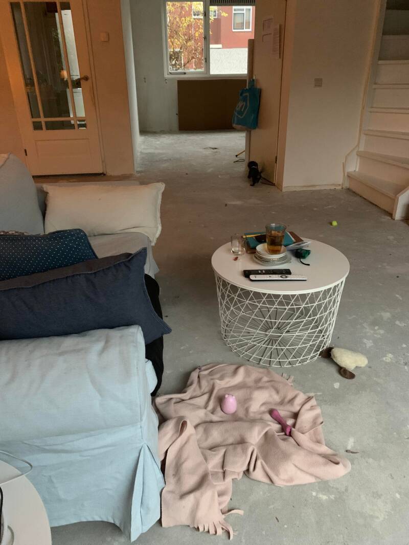 Het is éen grote stofbende in huis en kamperen is naar mijn idee heel wat comfortabeler dan dit. En dan die zooi. Tot aan het plafond werden de verpakkingsmaterialen opgestapeld. Tussen de bedrijven door loop ik mijn pup in het gareel te houden en weg te sleuren bij de werklui en gevaarlijke onderdelen. Ze loopt met plastic, papier, gips en stenen te zeulen en ik maar rennen. Frank, onze aannemer is gek op haar en komt regelmatig even aaien en knuffelen, dat is wel heel aandoenlijk.
