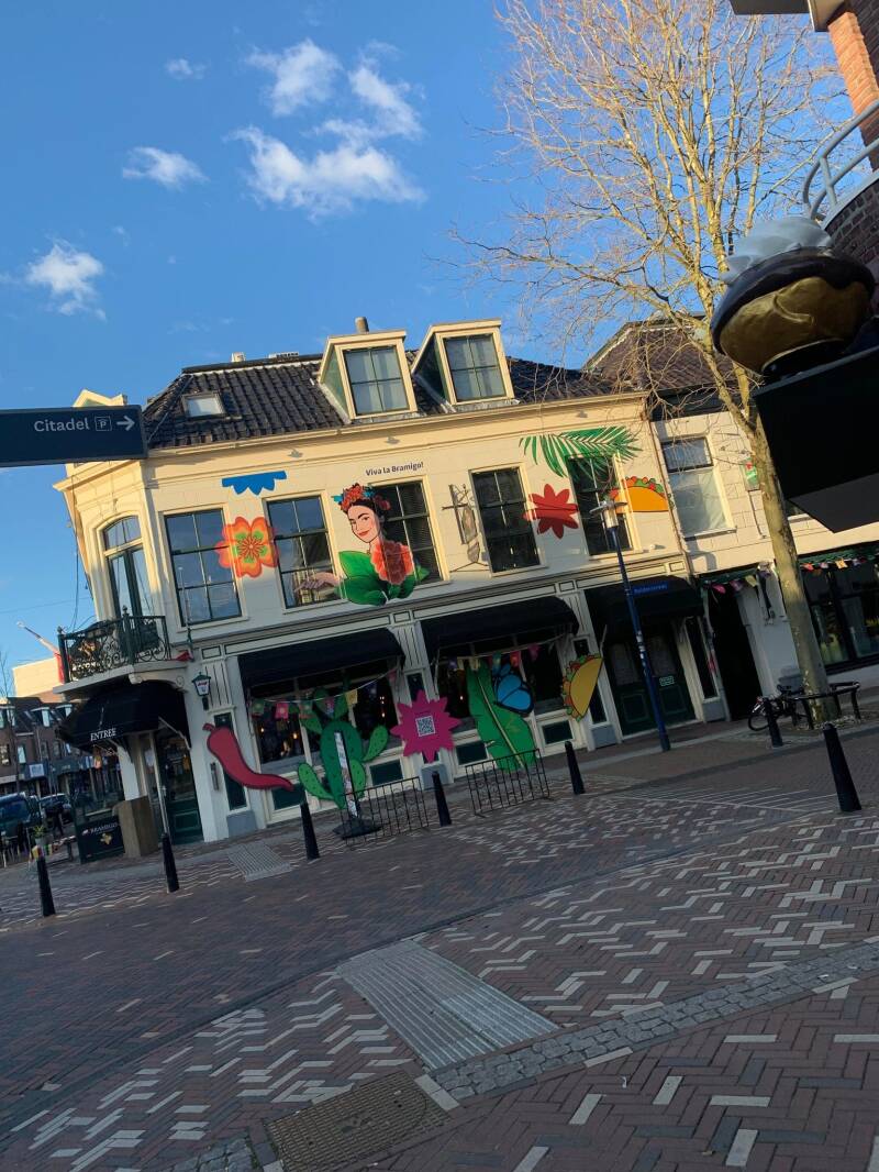 Tegen sluitingstijd lopen we het museum uit op zoek naar een gezellig restaurantje. We besluiten voor Mexicaans te gaan om geheel in Frida’s geest af te sluiten. Bovendien hebben ze daar vast Sangria. Die ben ik namelijk al twee keer mis gelopen de afgelopen twee weken. Ik heb er helemaal zin an. De gevel van het restaurant behoort ook tot een van de kunstwerken en vrolijk lopen we binnen. Ik zie al cocktails voorbij komen en vraag naar een tafel voor twee. Of we gereserveerd hebben? Nou, nee… ‘sorry, geen plek’. Nou, daar gaat mijn Sangria en Enchilada. Buiten Googelt mijn man op “Sangria Assen”. Te grappig. Die man weet wat zijn vrouw nodig heeft. Er komt een hit tevoorschijn en wij togen naar de desbetreffende tapas-boer. Die ligt naast het grote Frida hoofd. Het ziet er vol uit. Of we gereserveerd hebben? Je raad het al… Nou zeg! Ondertussen boeit me die hele Sangria niet meer als ik maar iets van vocht kan scoren want we barsten van de dorst. We lopen voor de zoveelste keer door het centrum en schieten een klein tentje in die nog genoeg plek heeft. Het blijkt de stam-tent van Assen en op de kaart staat stamppot. We slurpen een simpel Hollands biertje en wijntje en kiezen voor de stamppot proeverij. En zo vliegen we uit de Mexicaanse sferen de Hollandsche klei weer in. Helemaal goed en gezellig kletsend met deze Assense familie sluiten we de dag af.
