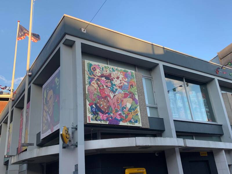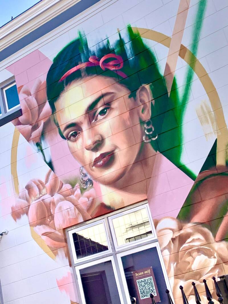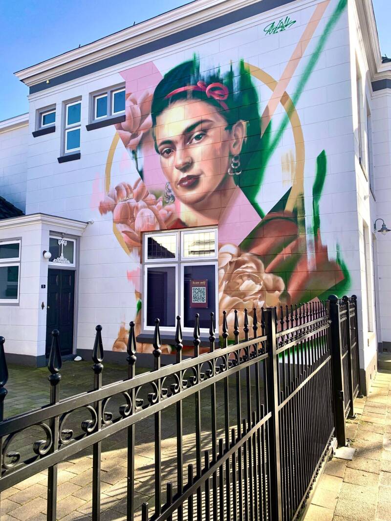 Frida Kahlo. Zij deelde haar gedachten en gevoel via haar kwast, vertelde haar leven. De bloemen, haar wenkbrauwen en die snor. Een bijzondere kunstenaar en vrouw. Marike was zo attent om mij folders te sturen over de tour en expositie in Assen. Zij woont daar. Dat moeten we zien! Gisteren vertrokken wij naar Assen. Ik was vergeten wat een pokke-end dat rijden is, maar goed, je moet er wat voor over hebben. Op zoek naar de juiste parkeerplaats zodat we bij het beginpunt kunnen beginnen, komen we al verschillende Frida’s tegen. De hele binnenstad viert Frida. Zodra we zijn geparkeerd snellen we naar een plek om te plassen en even bij te tanken met vocht en lekkers. Hotel de Jonghe heeft een tafeltje vrij tussen de gezellige drukte in de stad. Arjan checkt op FB in waardoor iedereen denkt dat wij een heel weekend aan de boemel zijn en ons een fijn weekend wensen. Naast ons zit een echtpaar met hun twee poedels. Dat doet me aan Saartje denken die op het filmpje dat onze meiden stuurden, naar buiten zat te staren om te kijken of wij al terug kwamen. Dat kleine portret heeft zich al diep in mijn hart genesteld. Maar dan nu op naar Frida. We lopen Kris kras door Assen maar komen toch alle street-art tegen. Als je in de folder de QR code in-scant krijg je de desbetreffende info over het werk. En tegelijkertijd zie je de mooie plekjes van Assen. Super leuk.