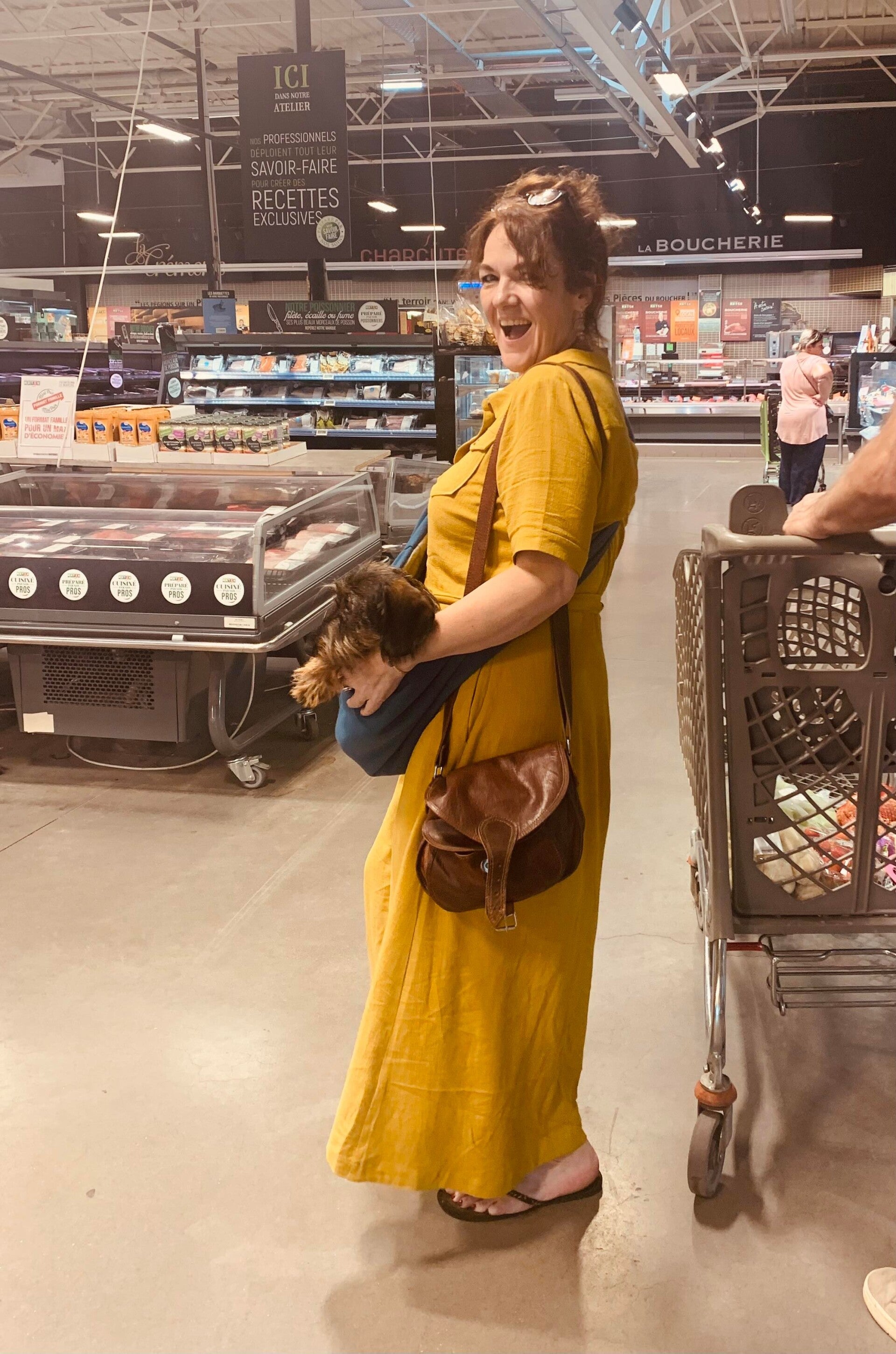 Als we hebben uitgepakt nuttigen we een stukje brood met jam in de salon. (woonkamer doen we even niet meer aan) en kijken we hoe de vrouwen het in de tour doen. Als we een beetje zijn bijkomen gaan we op pad om wat boodschappen in huis te halen. De mega bakker, supermarkt, Action en nog meer winkels liggen bij ons aan de overkant, 3 minuten lopen. Wat gaan we met Saar doen? Mogen er wel honden in de supermarkt? Ik ga het gewoon proberen in de tas. Als we worden weggestuurd merken we het wel. Ik word een beetje raar aangekeken maar niemand maakt amok. Het voelt wat ongemakkelijk maar Saar doet het geweldig in die tas, ligt gewoon relaxed te hangen en om zich heen te kijken. Als we klaar zijn rekenen Arjan en Isa af en ga ik vast met haar naar buiten. Daar loopt ze gewoon weer aan de lijn en als ik even met haar op het veldje loop zegt een vriendelijke oude fransoos mij gedag. Ik zeg Bonjour terug. Hij stopt en begint tegen me te praten. Ik versta er geen hol van en zeg in mijn beste Frans 'Je ne parle pas Francais'. Dat is zo ongeveer het enige wat ik goed mijn giegel uit krijg. De man vind dat ik dat toch erg mooi heb gezegd en kletst verder. Na een aantal keer 'je ne comprande' te hebben gezegd begin ik in het Nederlands terug te praten waarbij hij me aankijkt alsof hij zich afvraagt of ik niet lekker ben geworden. Dan zie ik Arjan en Isa giebelend naar mij kijken en zie ik mijn kans schoon. Ik zeg 'Ah my husband is waiting for me, ik moet nu gaan!' Hij kijkt me met grote ogen aan. Ik roep 'Bon journé, toedeloe' ik lach en zwaai enthousiast naar hem. Hij lacht schaapachtig terug en wenst me een fijne dag. Dat krijg ik dan wel weer mee.
