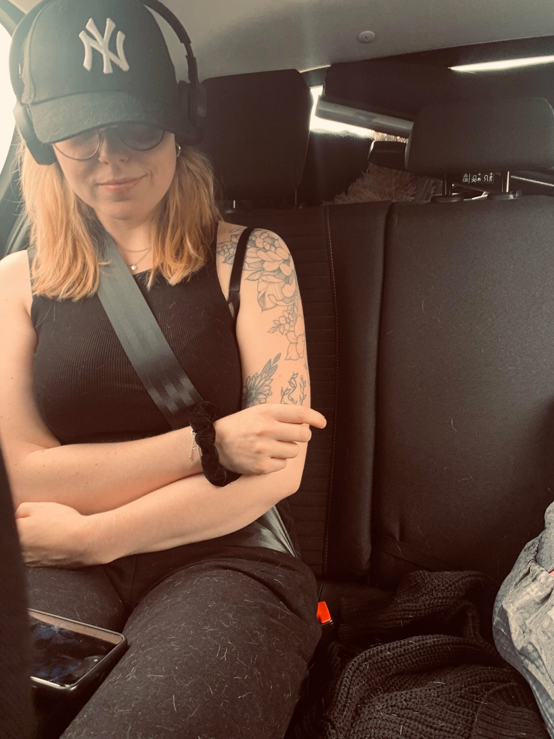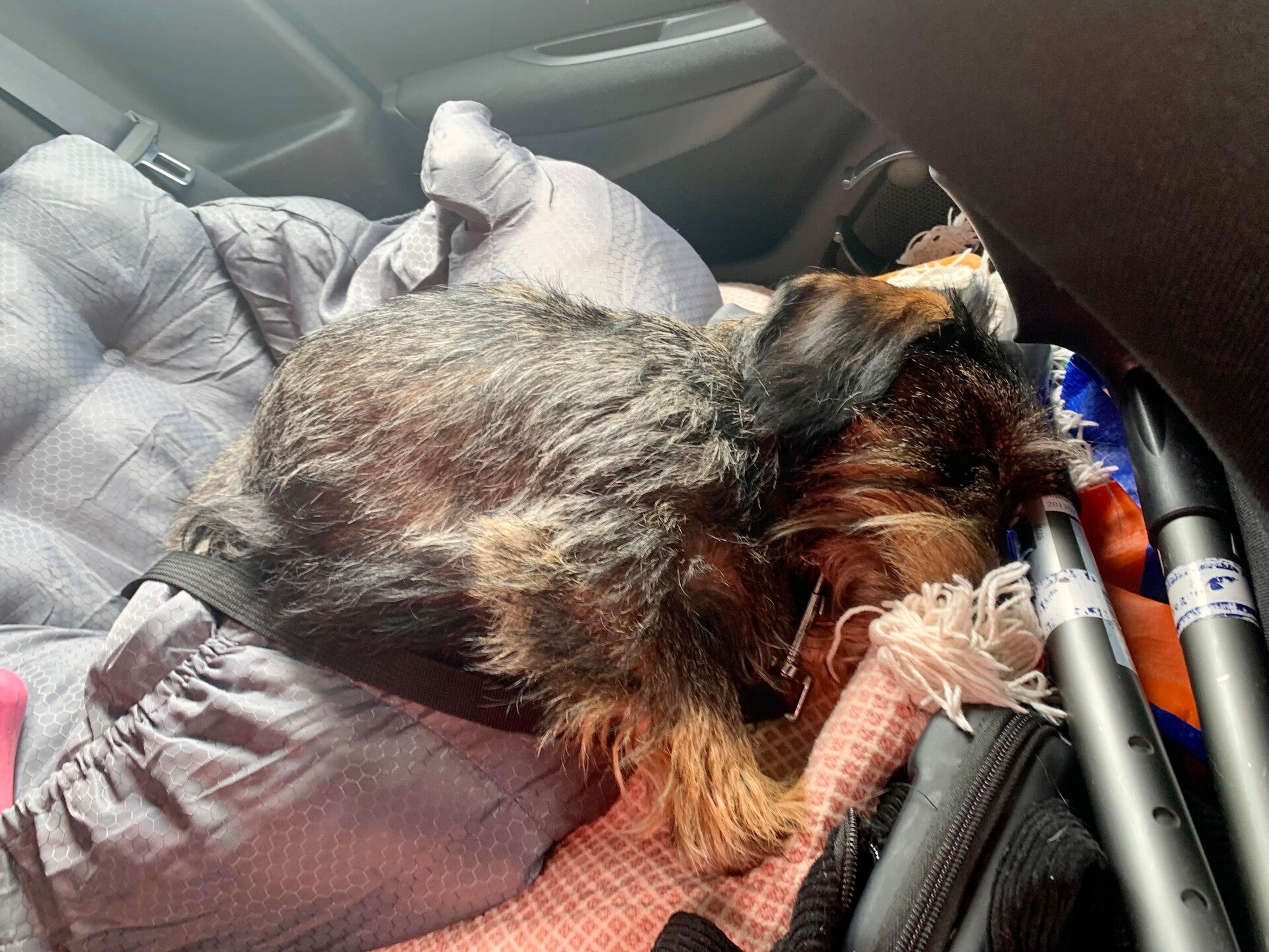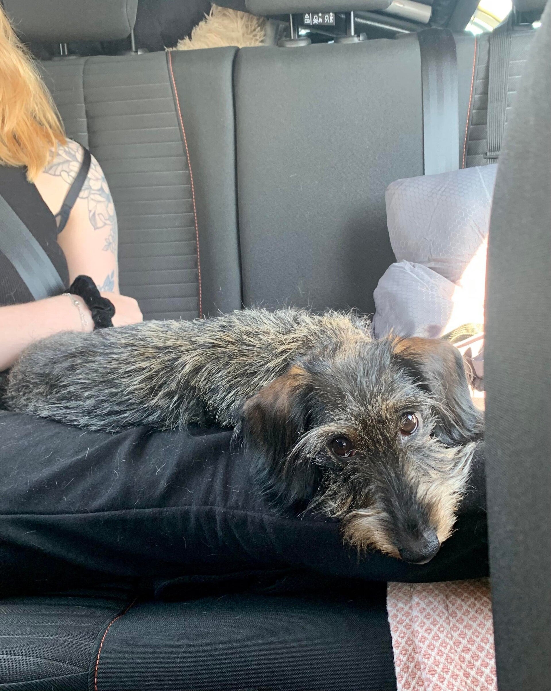 Die was even helemaal van haar padje vanmorgen. 'Wat gaan ze in hemelsnaam doen met mijn bench, mandje, speelgoed en voerbakjes??' moet ze gedacht hebben. Ze sprong op en neer en rende van hot naar her en week niet van mijn zijde. Ze heeft de hele buurt wakker geblaft. En wij maar zeggen; 'je mag mee meissie, we binden je echt niet aan een boom.' Ze mocht in haar nieuwe zetel, maar Saar zou Saar niet zijn als ze er overheen hangend ging liggen slapen of zelfs ernaast (het riempje is te lang) op Isa's benen om er later toch maar weer in te kruipen. Ze heeft het goed gedaan onderweg.
