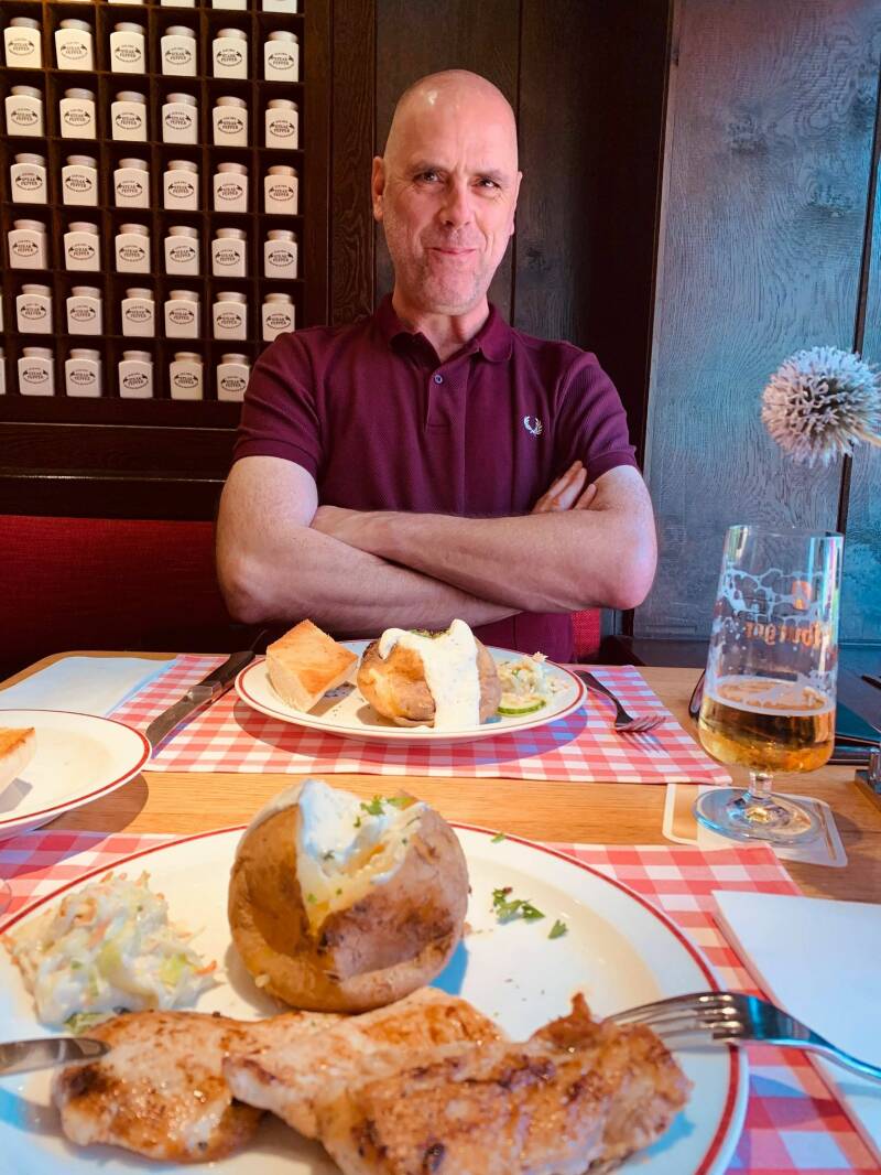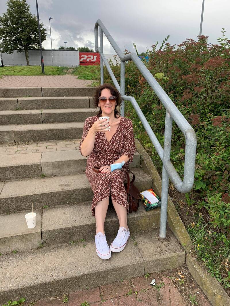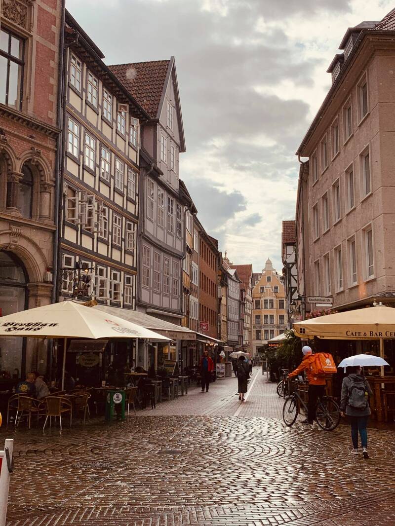 Die chocolademelk is niet te zuipen maar er is een struik die er vast van zal genieten. Pierre wacht geduldig en we rijden verder. We genieten van de supergeile muziek en rijden Hannover in. Onze navigatie meneer zegt dat we een milieu zone inrijden en dan gaat er een lampje branden. Shit, Ik ben die groene sticker vergeten te kopen! We rijden nu dus illegaal de zone in. Het is druk in Hannover maar we vinden al snel ons hotel dat midden in het centrum ligt. Het is wat onduidelijk waar we moeten parkeren en omdat ik drie woorden Duits spreek gaat Arjan het even vragen bij de receptie. Hij komt terug met een sleutel en aanwijzingen. Het blijkt dat we met Pierre en al in een lift moeten! Doodeng vind ik dat! Maar we overleven en komen veilig in de kelder aan. Met die sleutel moeten we een deur open maken die ons naar een nieuwe lift brengt en ons vervolgens weer bij de receptie aflevert. We checken in en moeten van alles invullen en onze Corona-check-app wordt serieus bekeken en genoteerd. We vragen waar we de groene milieu sticker kunnen kopen. Bij een pand waar “tuf” op staat, is het antwoord. Eerst maar eens naar de kamer. Die gaat open met een volgende sleutel en heeft een interieur uit de vorige eeuw. Maar hé, we hebben een bed en een douche.