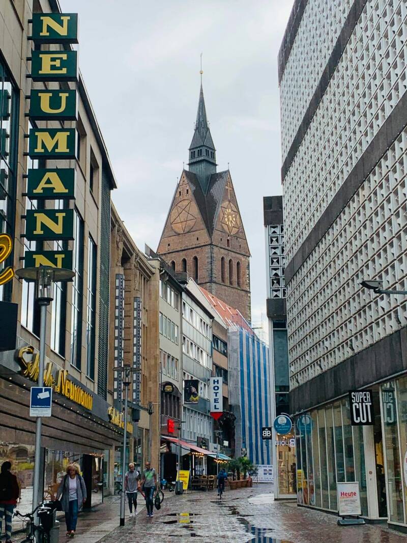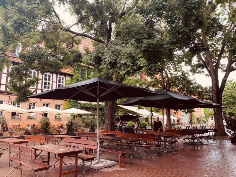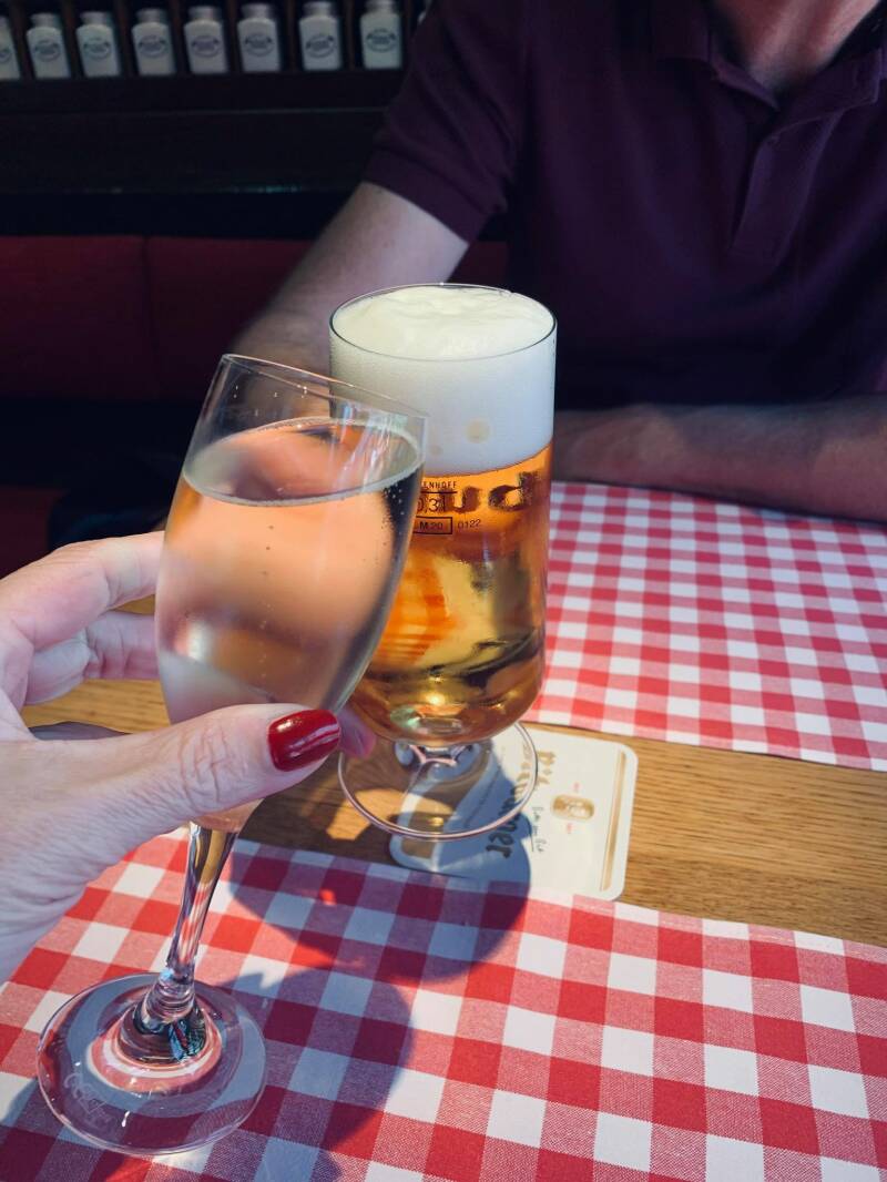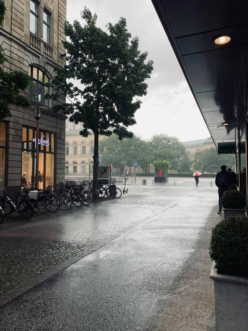 Dan krijg ik een hartverlamming, van een dikke onweer knal. Dat is hier in Hannover dus ook gearriveerd. De hemel breekt open en we schuilen onder een afdakje. Als het droog wordt en de zon zich weer laat zien vervolgen we onze citytrip. Winkels, veel fastfood tenten en opeens lopen we in de pc hoofdt van Hannover. Fancy tentjes en dure kleding. Maar al wat wij zien, geen tuf. We googelen en lezen dat we de inmiddels fel begeerde sticker ook bij een tankstation kunnen kopen. Morgen dan maar. Ondertussen zijn we hard toe aan drank en voedsel en we installeren ons in een oer-Duitse tent. Geen mojito op de kaart maar wel een overheerlijke prosecco, mijn lief geniet van zijn biertje. We eten lekker en hebben geen toetjes-ruimte meer. We zijn moe en besluiten ons lekker op de hotelkamer te installeren met koffie en thee. We hebben geen waterkoker op de kamer dus we gaan naar de afdeling waar we morgen gaan ontbijten maar nergens koffie en thee. We vragen het bij de receptie. De receptie mevrouw gaat vervolgens voor ons een bakkie zetten en vraagt of we nu willen betalen of bij het uitchecken. Nou ja zeg!