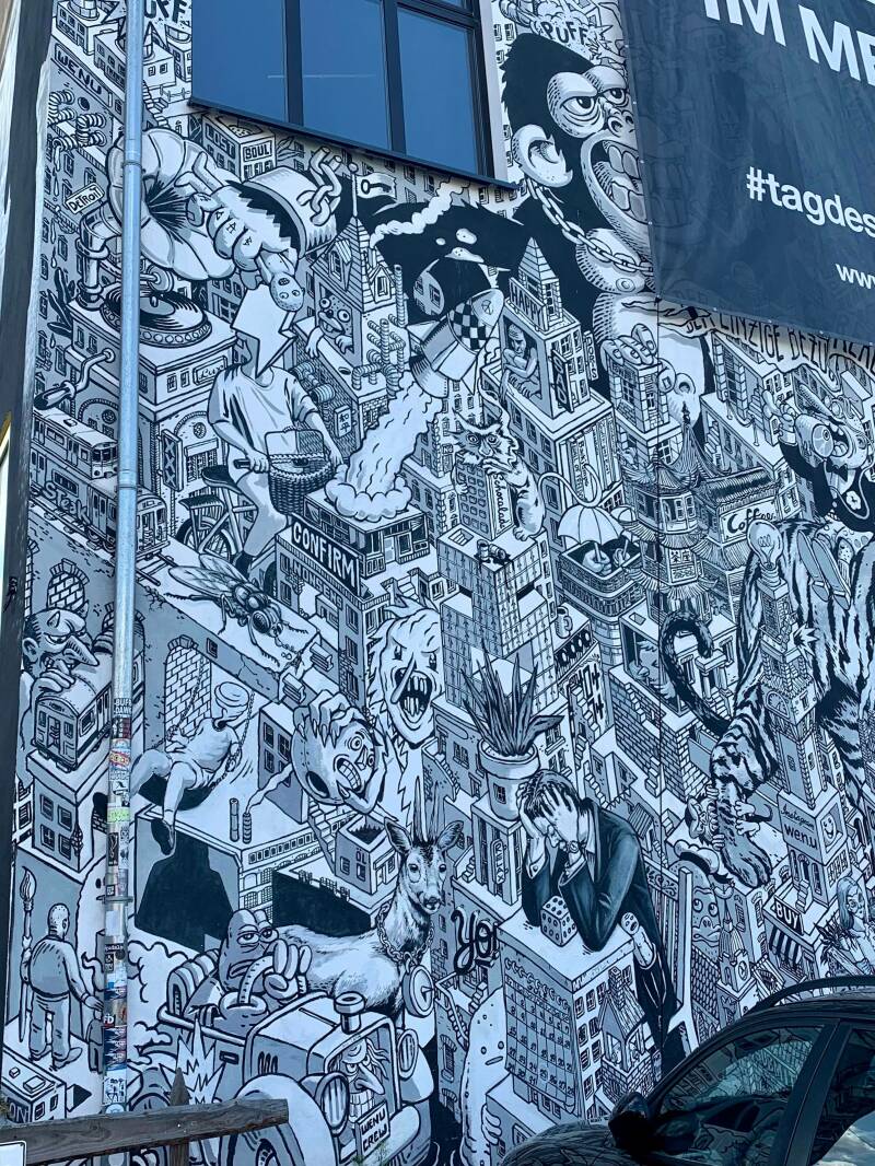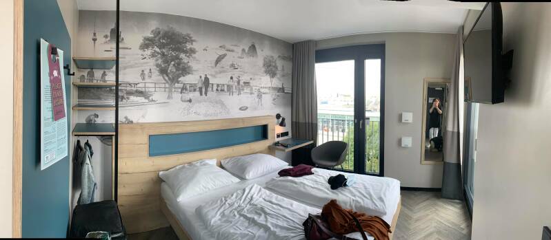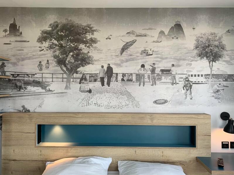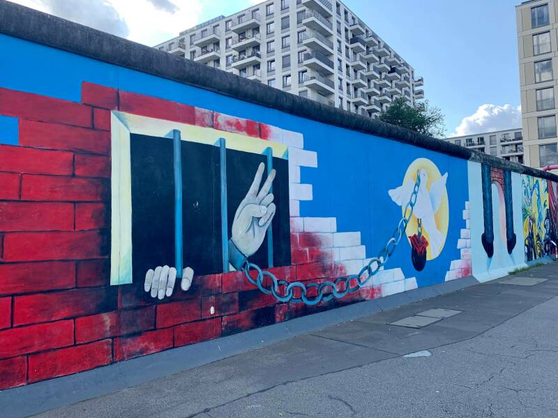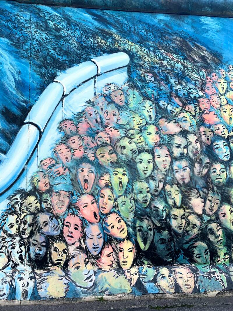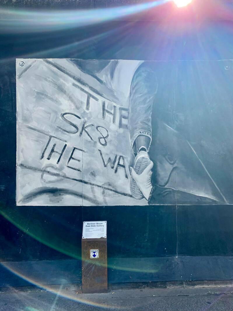 En dan rijden we Berlijn in. We staan overal vast. Een drukte van belang maar zo hebben we wel de tijd om om ons heen te kijken. DDR gebouwen afgewisseld met moderne nieuwbouw, het is wonderlijk om te zien. Veel graffiti, daar herken ik Berlijn in. De bedelaars staan hier op de weg en lopen met hun bekertje langs de wachtende auto’s. Dit keer zien we eerst de parkeergarage en Arjan stuurt Pierre naar binnen. We lopen het supermoderne en hippe hotel in. Bij de prachtige met boeken gevulde receptie hoeven we niks meer te doen. Ik heb online al ingecheckt en een app gedownload waar onze sleutel in staat. Telefoon voor het slot houden en je bent binnen. We reizen door naar de 7e verdieping en helemaal aan het eind van de mooie gang met bij elke deur een mooi bordje en deurbel, is onze kamer. Wij zitten helemaal op het hoekje met drie grote ramen en uitzicht op de Berlijnse muur. Wat een bof! Aan de overkant het station waarvandaan we morgen kunnen gaan OV-en. We frissen onszelf even op en gaan op pad. Ons hotel blijkt letterlijk tussen de muur in te staan. We lopen eerst langs het water en dan terug langs de muur. Fantastische kunstwerken krijgen we te zien. indrukwekkende exemplaren ook, die brengen de bekende beelden naar boven.