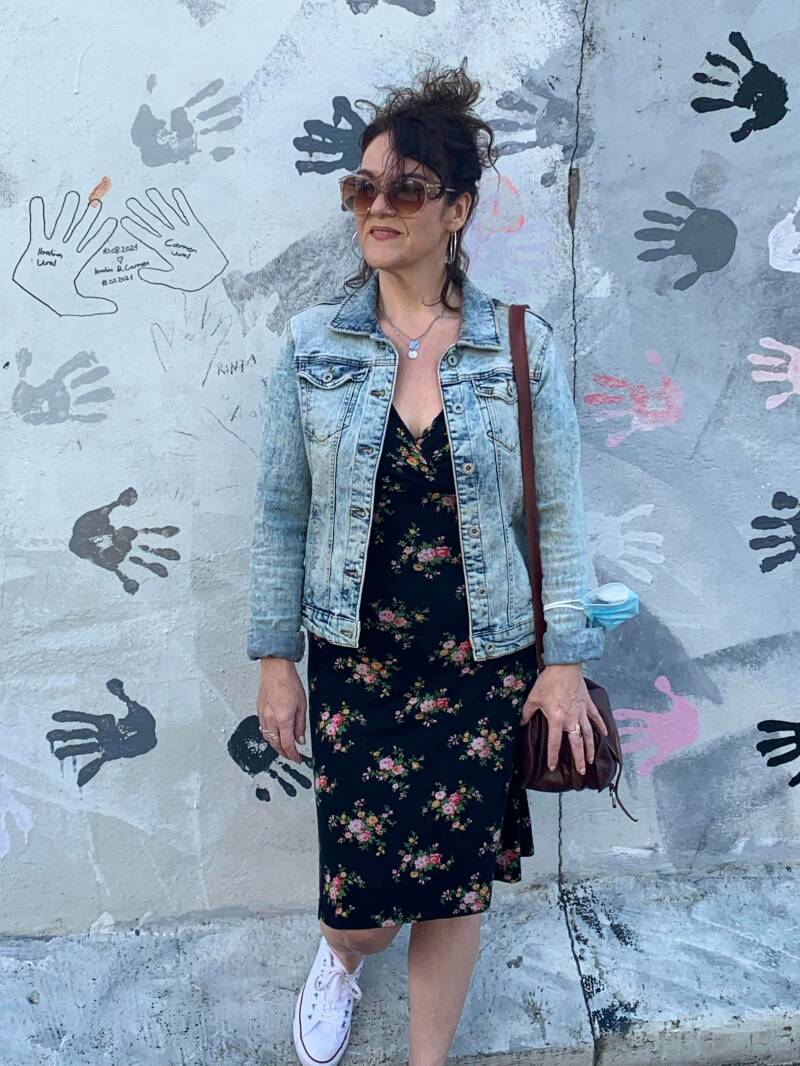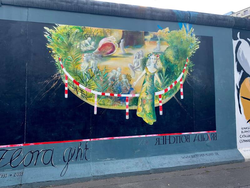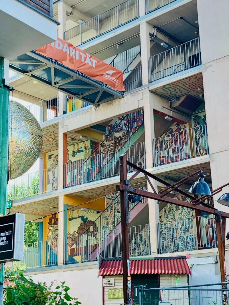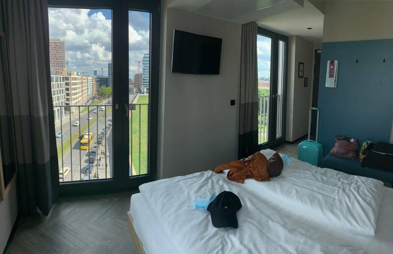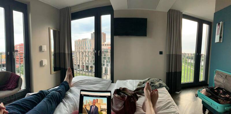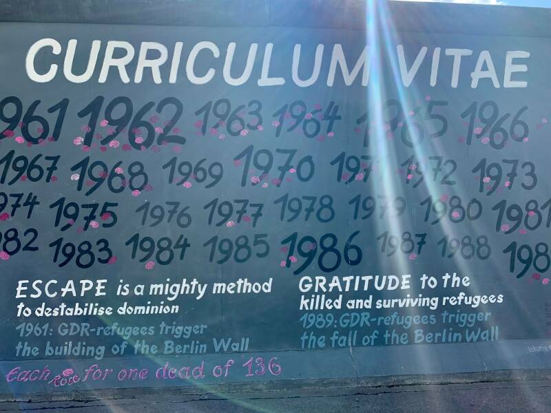 En dan rijden we Berlijn in. We staan overal vast. Een drukte van belang maar zo hebben we wel de tijd om om ons heen te kijken. DDR gebouwen afgewisseld met moderne nieuwbouw, het is wonderlijk om te zien. Veel graffiti, daar herken ik Berlijn in. De bedelaars staan hier op de weg en lopen met hun bekertje langs de wachtende auto’s. Dit keer zien we eerst de parkeergarage en Arjan stuurt Pierre naar binnen. We lopen het supermoderne en hippe hotel in. Bij de prachtige met boeken gevulde receptie hoeven we niks meer te doen. Ik heb online al ingecheckt en een app gedownload waar onze sleutel in staat. Telefoon voor het slot houden en je bent binnen. We reizen door naar de 7e verdieping en helemaal aan het eind van de mooie gang met bij elke deur een mooi bordje en deurbel, is onze kamer. Wij zitten helemaal op het hoekje met drie grote ramen en uitzicht op de Berlijnse muur. Wat een bof! Aan de overkant het station waarvandaan we morgen kunnen gaan OV-en. We frissen onszelf even op en gaan op pad. Ons hotel blijkt letterlijk tussen de muur in te staan. We lopen eerst langs het water en dan terug langs de muur. Fantastische kunstwerken krijgen we te zien. indrukwekkende exemplaren ook, die brengen de bekende beelden naar boven.