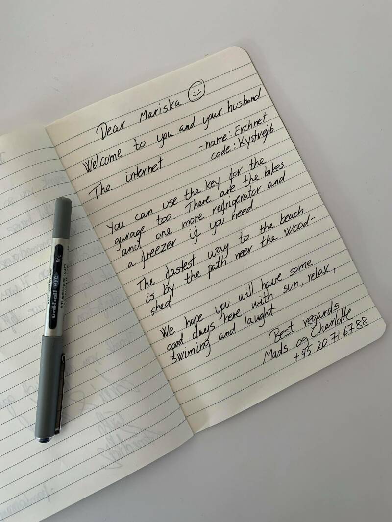 Een paar huizen terug vinden we nummer 6 met het huis van de foto. En jonghu, het is nog veel beter dan op de foto! Wat een heerlijk huis zeg. Met 3 zitjes buiten en een enorm stuk tuin. Binnen is het gezellig en brandschoon. En om het paradijsje compleet te maken , het strand op nog geen 150 meter lopen. Charlotte heeft een vriendelijk berichtje voor ons achter gelaten.