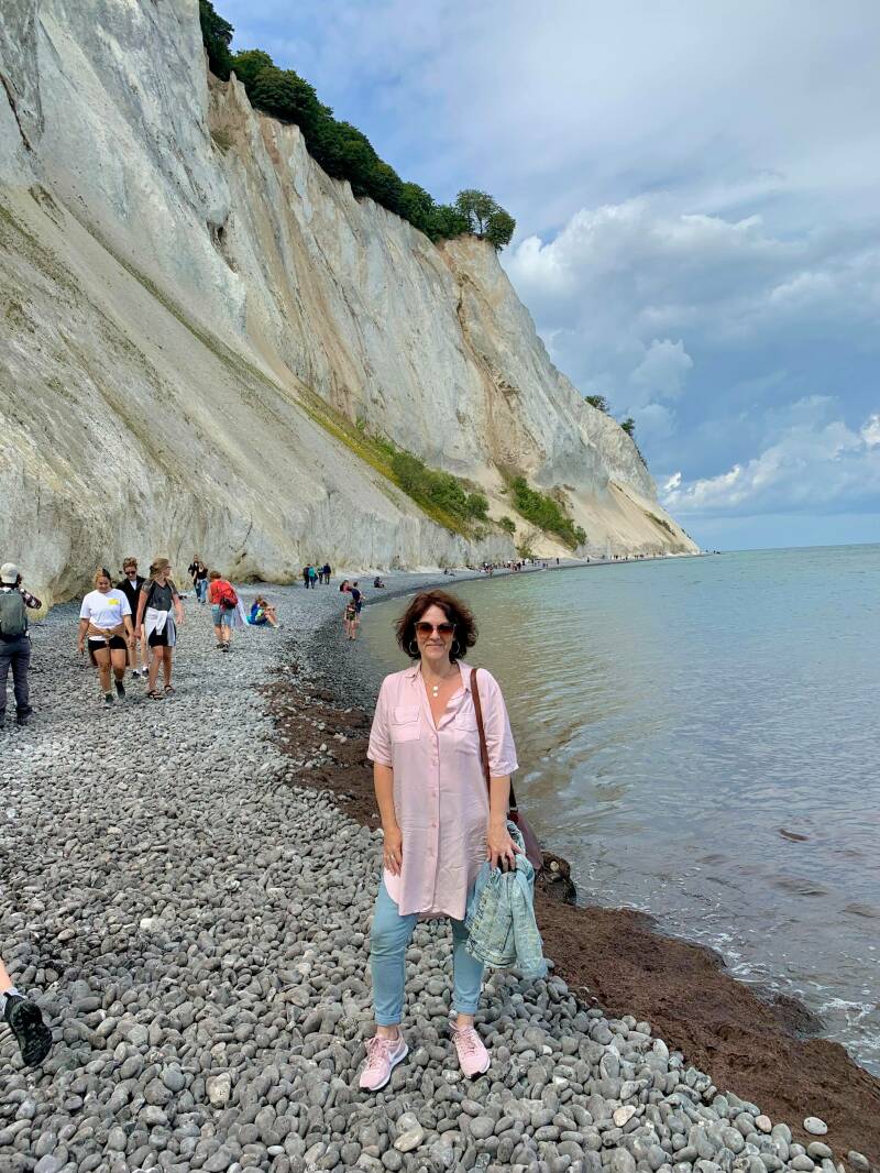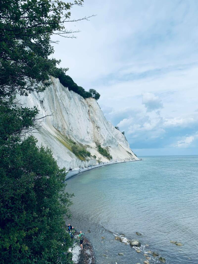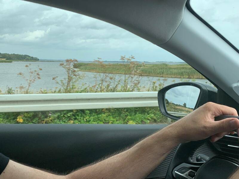 We rijden richting het derde eiland Møn. We gaan over een grote brug. Eerst naar boven en dan weer naar beneden om op Møn te komen. Er ligt een lange weg die de eilanden van elkaar scheid. Gewoon in het water gemaakt. Alleen die weg en water er om heen. Het is wonderlijk om te zien. Even later wordt het landschap anders. heuvelachtig. Het is hier prachtig! We rijden een havenplaatsje in, wat gezellig hier, maar je moet prioriteiten stellen en we rijden verder, recht zo die gaat! Nou ja recht, veel bochten en heuvels en dat voelt als een echte roadtrip.