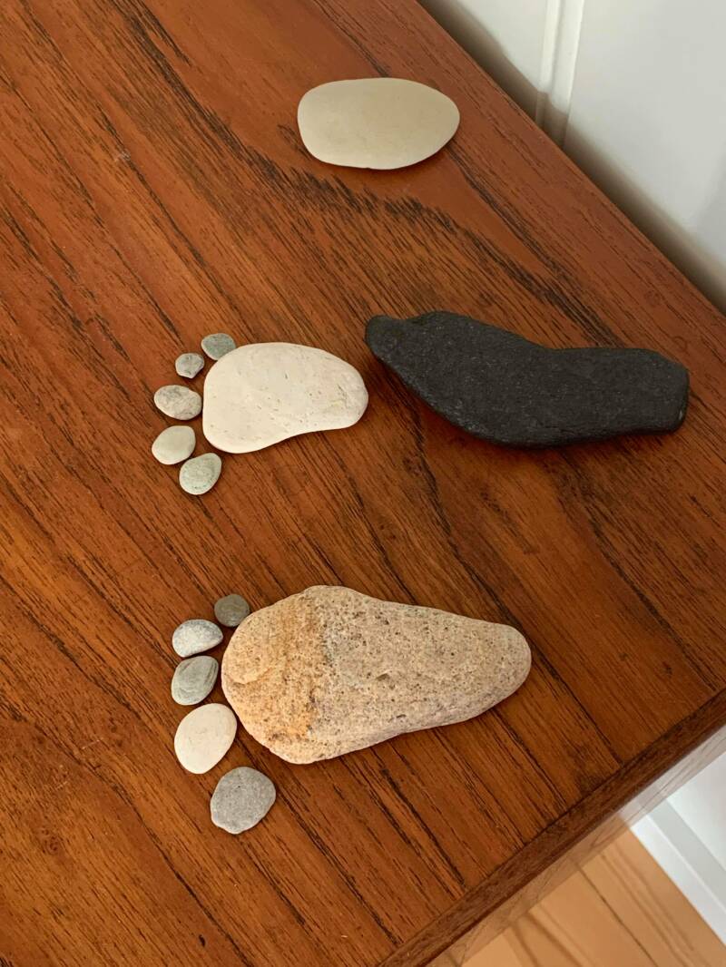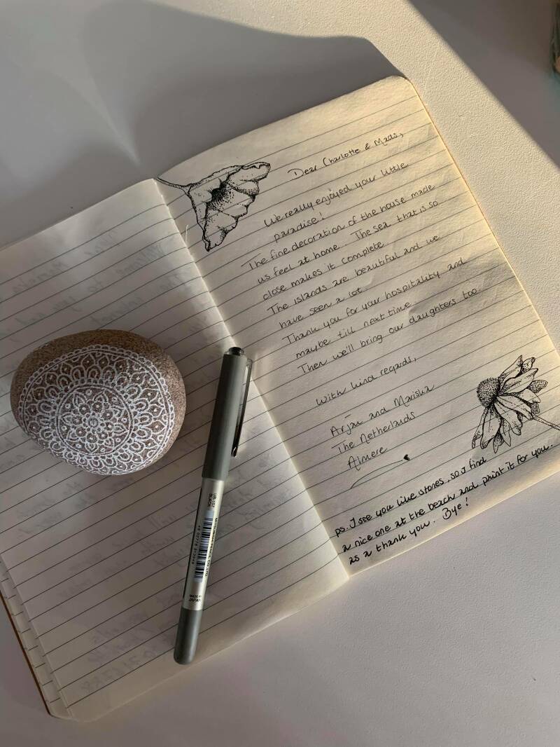 We rijden een andere route naar huis en zien leuke weggetjes en liefelijke dorpjes. Møn zeggen we weer gedag en we rijden verder naar onze thuishaven in Falster. Eerst even wat eten nu. Morgen gaan we weer verder met ons laatste stukje van de reis. Ik wil iets achterlaten voor Charlotte om haar te bedanken voor de gastvrijheid en dat wij gebruik mochten maken van haar kleine paradijsje. Charlotte houd van stenen. Het hele huis ligt er mee vol. Ik toog naar het strand en zoek daar een mooie steen uit, in het water liggen er genoeg. Ik maak er een Mandela op en denk dat ze dat wel leuk zal vinden. En Maris zou Maris niet zijn als ik niet een klein tekeningetje achter zou laten in het gasten-schriftje.