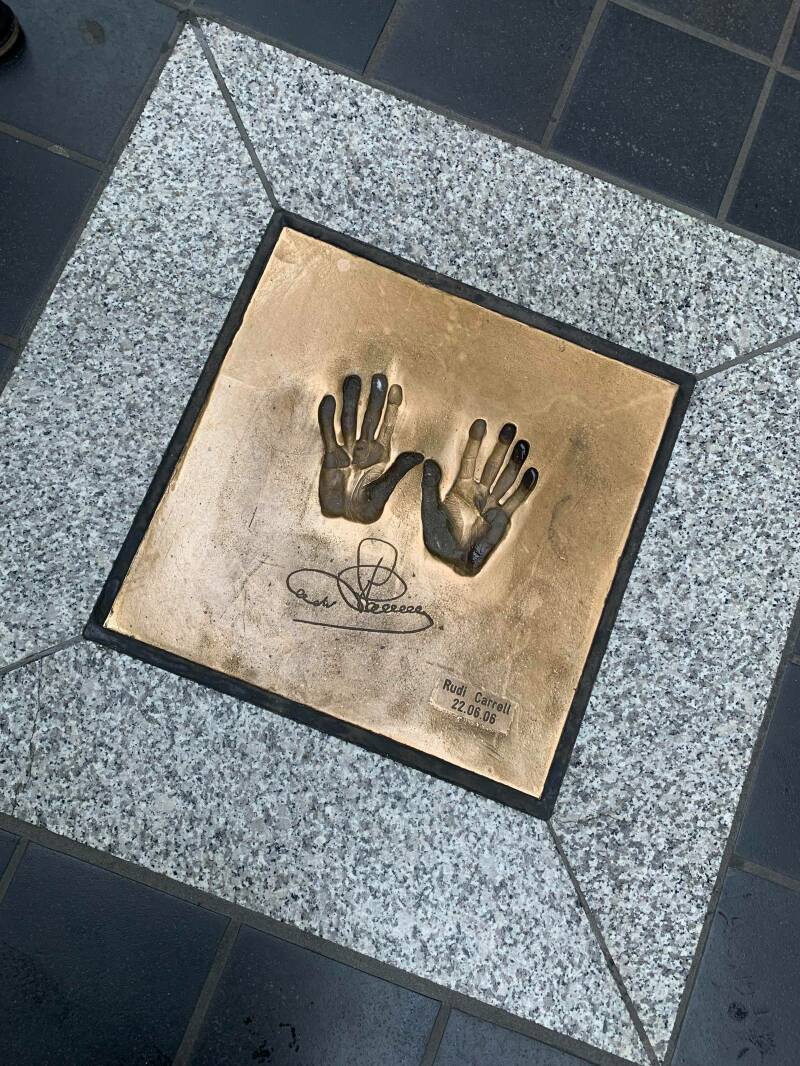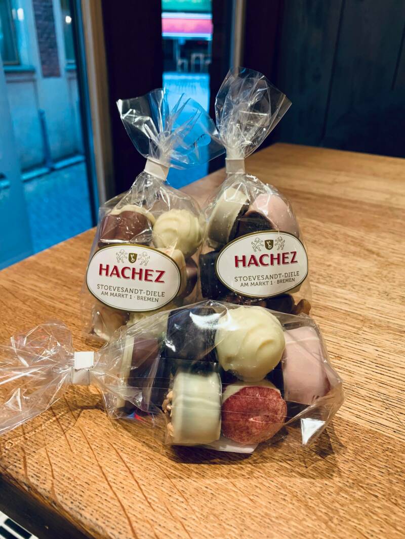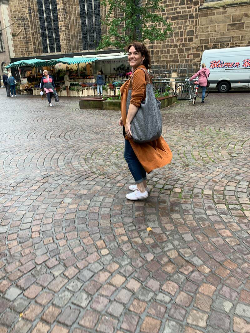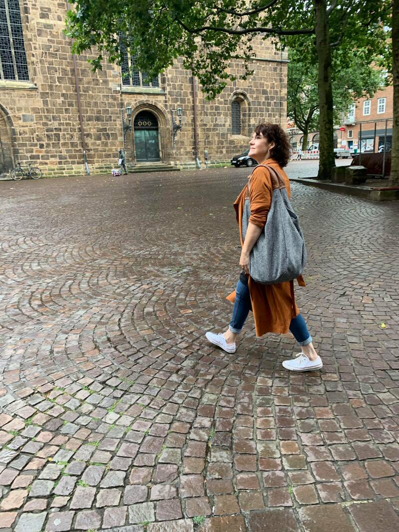 We hebben lekker geslapen in Bremen en we worden verwend met een uitgebreid ontbijtbuffet. Na de zwoele zomeravond is het vandaag andere koek. Het water komt met bakken uit de hemel. De meisjes vragen hoe laat we ongeveer thuis zullen zijn en maken een schatting. Ondanks de regen willen we toch nog even Bremen in. Die tas, die ik gisteravond in de etalage van een fair trade winkel heb gezien heeft zich in mijn hoofd genesteld en moet toch echt even van dichtbij worden bekeken. Bovendien zitten mijn verjaardagscenten nog braaf in mijn portemonnee te wachten op een juiste bestemming. De buien wisselen elkaar af maar ondanks dat is het nog best gezellig druk in de stad. We besluiten voor de meisjes chique bon bons mee te nemen uit een schattig winkeltje. Vele keuzes en smaken zijn er te vinden in de vitrine. Eén voor een wijs ik het meisje achter de toonbank een bonbon aan waarvan ik denk dat mijn meisjes die lekker zullen vinden. Mango en witte chocolade voor Julia, Aardbei en wit voor Kiki en voor Isa pistache en andere noten. En ach, doe er voor mijzelf ook maar een paar. In dat andere winkeltje werd de vader des huizes verlieft op een bijzonder mens erger je niet spel dat in de etalage stond te seinen. Je moet weten dat dat HET favoriete spelletje in ons gezin is. Als we er weer langs komen gaat hij overstag en we vragen er naar aan de mevrouw. Of we er eén of twee willen? Wat een rare vraag. Doorgaans heb je aan eén bordspel wel genoeg toch? Ze pakt hem mooi voor ons in en we gaan door. We zijn de fair trade winkel nog niet tegengekomen. We snappen er niets van want hij zat hier toch echt ergens in de buurt. Onderweg komen we een overdekte winkelstraat tegen en we lopen er in om even droog te lopen. Het blijkt een heuse Walk of Fame waar we de hand van Rudi Carrell tegen komen. Voor onderweg kopen we broodjes bij de verse bakker. Beter dan die slappe meuk van onderweg en de helft goedkoper. Nog steeds geen zicht op de fel begeerde winkel. Als we het bijna willen opgeven zie ik de zwijntjes van gisteravond. We volgen het spoor dat we in het donker hebben gelopen, ja, hier kwamen we langs en toen zijn we rechtsaf gegaan bij die horloges en als we hier afslaan.... Ja! gevonden. Ik loop direct naar de tassen toe. Veel keuze in stof en motief. Maar eigenlijk ben ik snel klaar, die tweed, die moet het worden. De vriendelijke winkel-mevrouw komt naar ons toe en ze laat de tas van binnen zien. Als ze hem open slaat heeft hij vakjes en ritsjes en er kan wel een heel kind in. Maar dat zie je er aan de buitenkant niet aan af want het is zodanig ontworpen dat hij mooi dichtvalt. Nou ja, echt klein ziet hij er ook niet uit, maar dat kan me niet schelen. Daar passen straks lekker al mijn werkspullen in. Ze vertelt dat het bijzondere tassen zijn en geeft me een blaadje mee met het verhaal er op. Ik ga blij en opgetogen de winkel uit en mijn man schiet een heuse fotoschoot van Me and bij bag.
