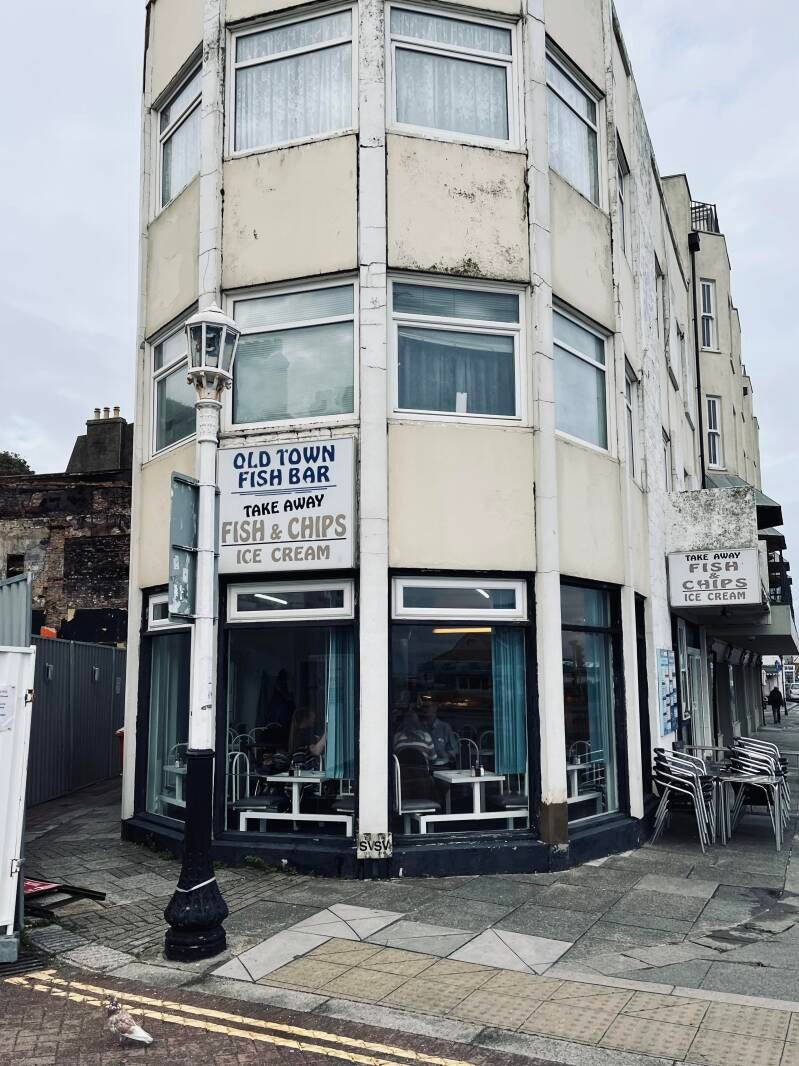 Het is inmiddels droog en het begint op te klaren. We doen wat boodschappen bij de plaatselijke buurtsuper en zien aan de gebouwen dat Hastings uit veel vergane glorie bestaat. Gebouwen die ooit prachtig moeten zijn geweest zijn nu in verval en bijna alles lijdt hier onder achterstallig onderhoud. We ploffen met onze boodschappen neer in een Fish and chips tentje. De stoelen zitten vast aan de grond en onder onze voeten ligt tapijt. Het blijft een wonderlijke keuze voor vloerbedekking in een eet-tent maar het is typisch Engels. We nemen een small portie maar ontvangen een bord vol. Krijg ik natuurlijk nooit op. We hebben onze vork nog niet neergelegd of de borden worden al opgehaald en er wordt gevraagd of we willen afrekenen. Zo hee, die heeft haast. We vermoeden dat ze gaan sluiten wat verklaard dat we nog net niet de deur uit worden geduwd.