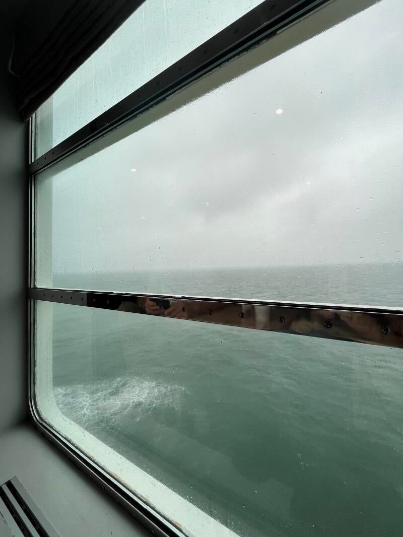 We krijgen te horen dat de boot een half uur vertraging heeft vanwege het zware weer. Oh oh, is het zo erg op zee? We nemen onze plaats in de rij en om de tijd te doden gaan we maar weer eens even plassen en in de taxfree shop rondwandelen. Mensen komen daar met vele flessen drank naar buiten. Wij doen aan kijken kijken niet kopen.