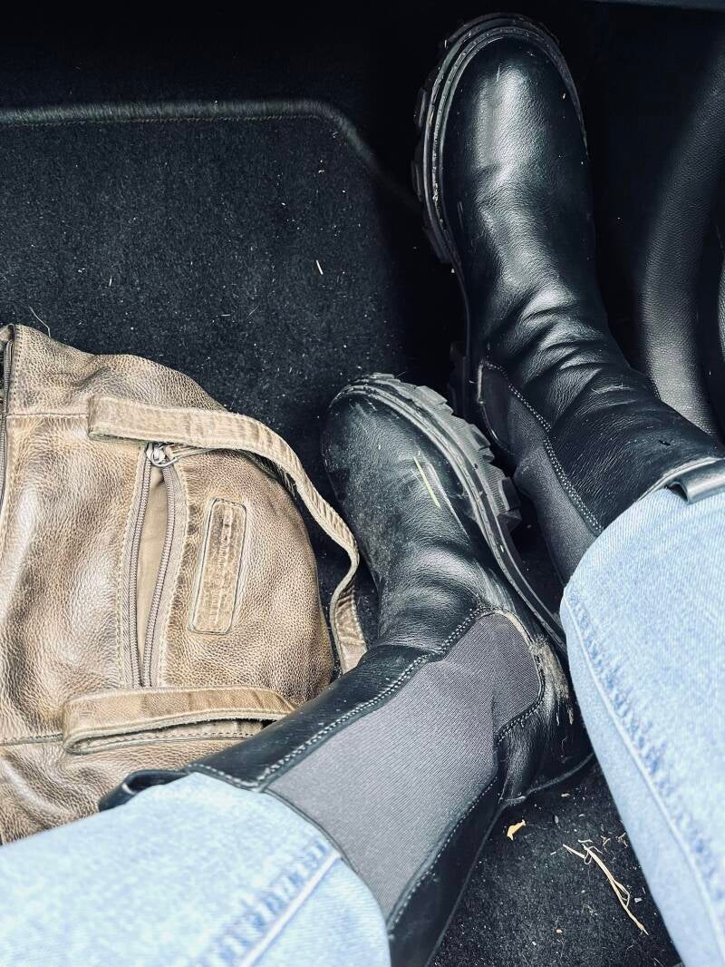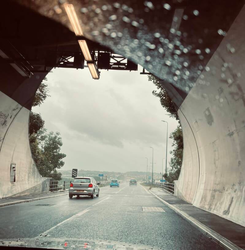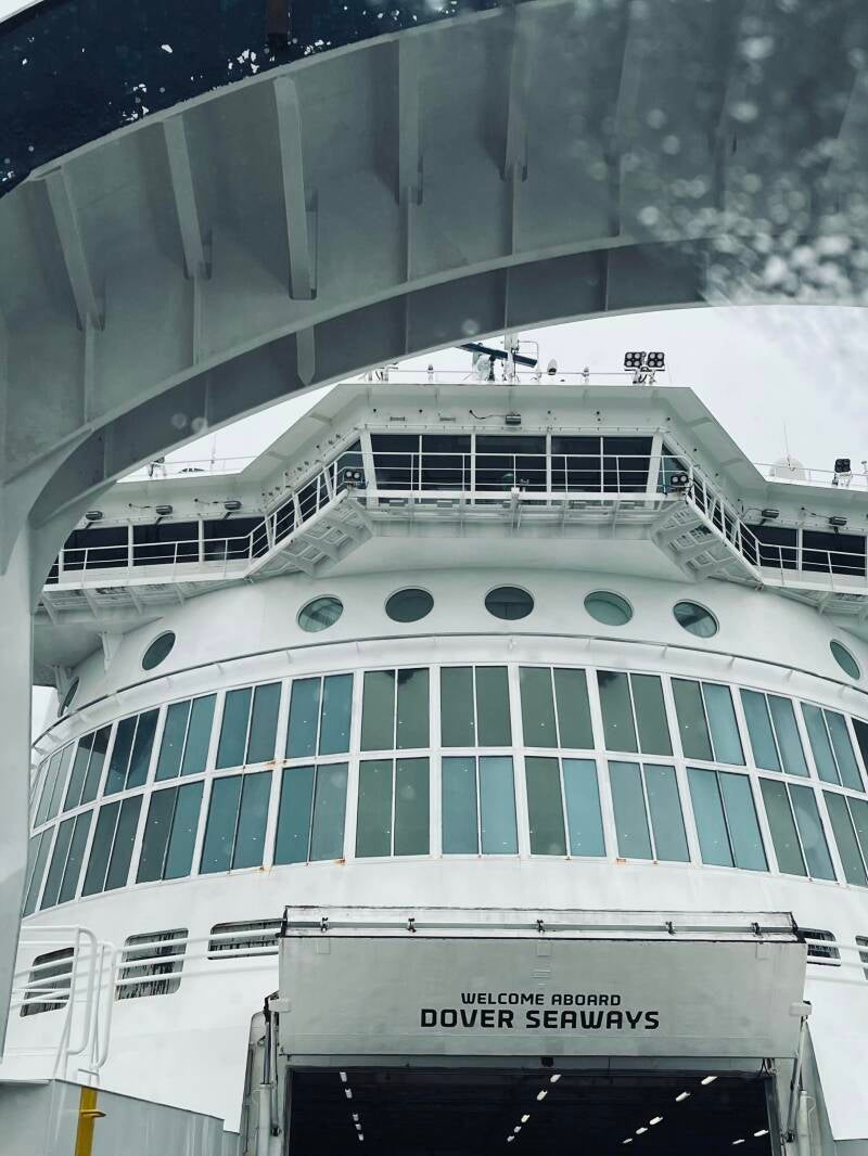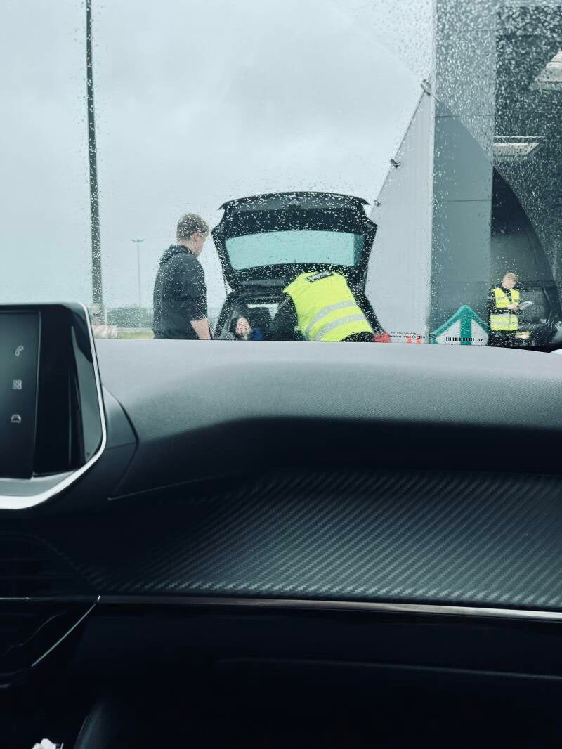 Ik heb op het laatste moment mijn stevige stapper laarzen omgeruild met mijn nieuwe witte all stars want dat weer... Mijn dikke vest grijp ik ook nog even mee. En dan gaan we rijden. We hebben bijna 4 uur voor de boeg en moeten ons een uur van te voren melden bij de gate in Duinkerken. We hebben nog een extra uur gereserveerd voor de plasjes, de koffie en eventuele files. Eenmaal lekker op weg begin ik me af te vragen of ik, als bijrijder, ook een airbag heb. Het dashboard ziet er niet zo uit. Volgens mijn chauffeur zit het ding er echt wel in maar ook hij haalt zijn wenkbrauwen op als hij eens goed kijkt. Er zit niets anders op dan het boekje er eens op na te slaan. Voor dat soort dingen hebben we opeens tijd. En ja hoor, onze Pierre is netjes voorzien van twee airbags. We kunnen weer met gerust hart verder, je kan het maar beter even weten. Na de nodige plasjes en toch wat korte files komen we in Duinkerken aan en moeten we door 6 controle poorten waar tickets, paspoorten en auto gecheckt worden. De eerste poortjes hebben Franse medewerkers, de laatsten worden bemand door de Engelsen. We moeten 2 keer onze paspoorten tonen en de achterbak en achterbank laten zien. Voor ons rijden een drietal Engelse jongens en als daar de achterbak opengaat komt er een enkele hand tevoorschijn. Die hand komt achter alle meuk vandaan en houdt een voorwerp vast om te voorkomen dat het uit de auto valt als de deur opengaat. Het is een hilarisch gezicht. Bij de tweede keer verkneukelen wij ons al op dat beeld en ja hoor, daar is hij weer! Ik kan er nog net een foto van schieten.
