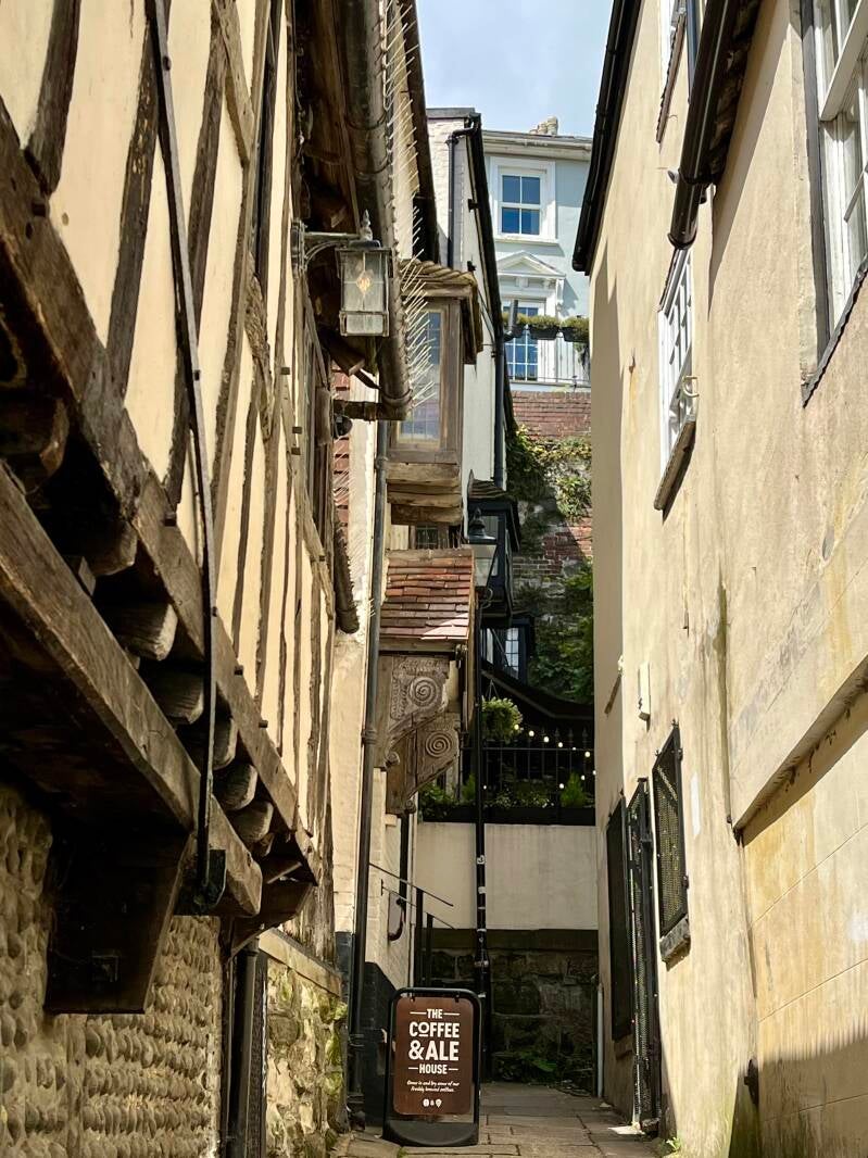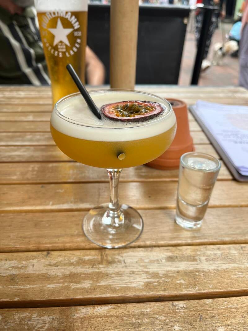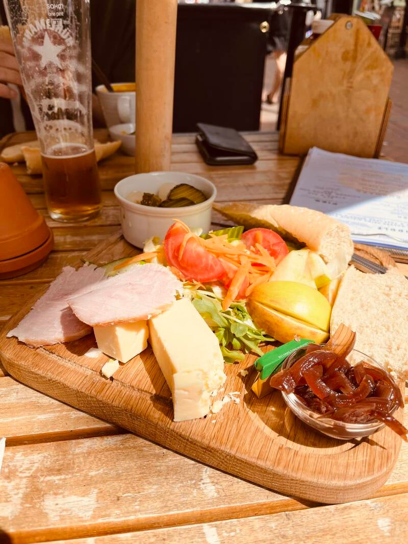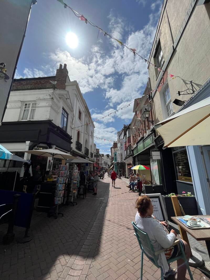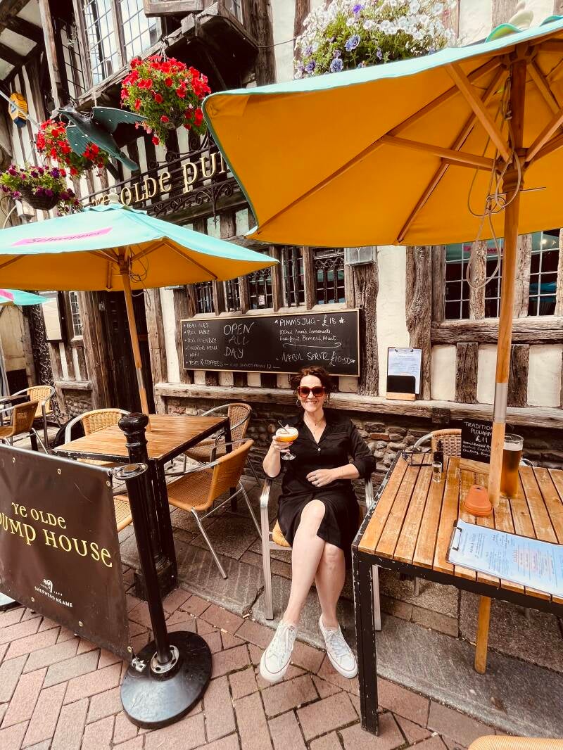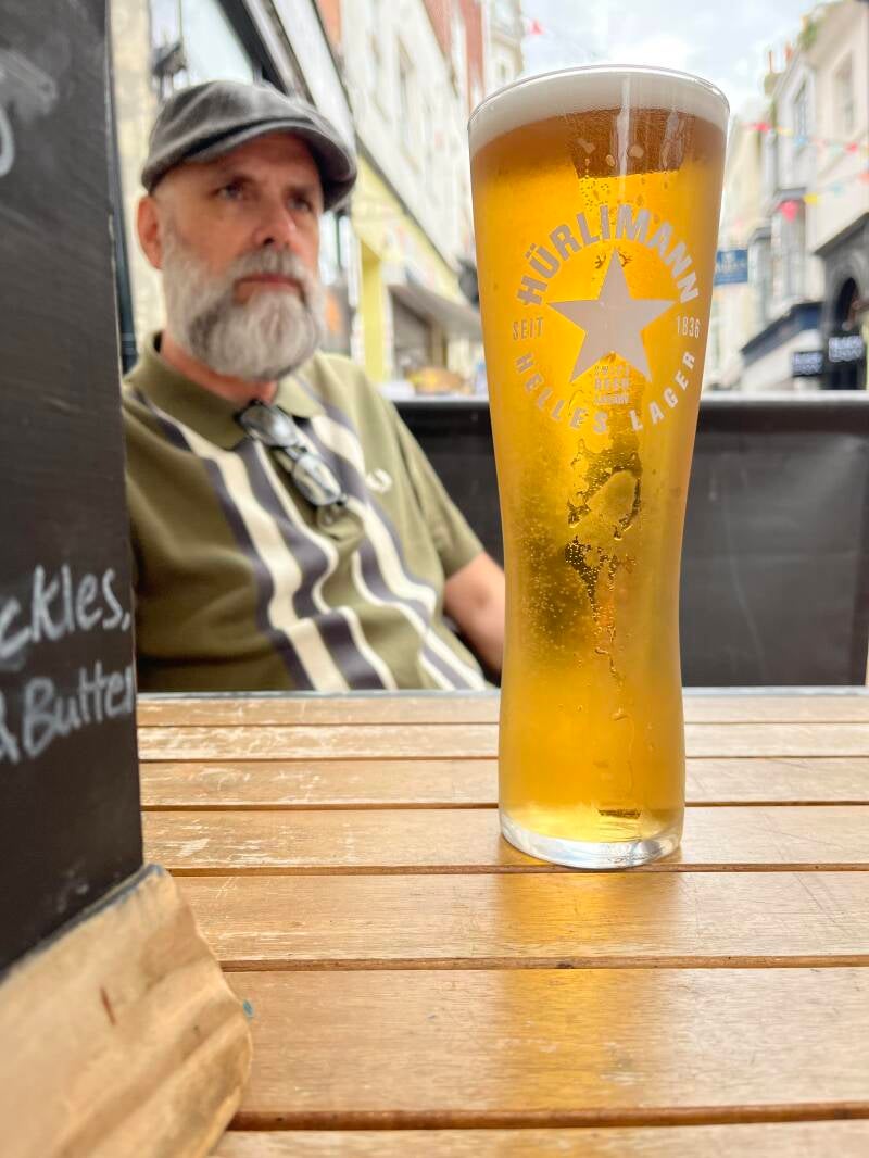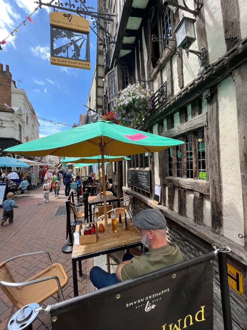 Daarna lopen we zo het oude centrum in waar we de mooiste oude pandjes zien en leuke winkeltjes vol met oude meuk en nieuwe meuk. Ik ben er dol op! We drentelen door de stad en als we een gezellig winkelstraatje tegenkomen gaan we bij een oude pub op het kleine terras zitten. We wachten tot er iemand onze bestelling komt opnemen en we ruilen van stoel omdat ik graag elke zonnestraal wil vangen en Arjan die juist moet ontwijken. De Engelse dame naast ons moet er om lachen en we zijn het eens dat je alle zon die kan krijgen meteen moet pakken. Ik heb al gezien dat ze hier ook bekend zijn met de Pornstar Martini, is dat even boffen. We hebben al lang en breed uitgezocht wat we willen hebben maar het duurt en het duurt maar er komt niemand. Dan leest Arjan dat je binnen aan de bar moet bestellen. Als we nou eens beter zouden lezen... En dan komt ons lekkers, het zonnetje schijnt vrolijk en we genieten. Bewust van het feit dat we dit maar mooi kunnen doen samen. Zelfs die klodder soep die ik op mijn been knoei kan de pret niet drukken.