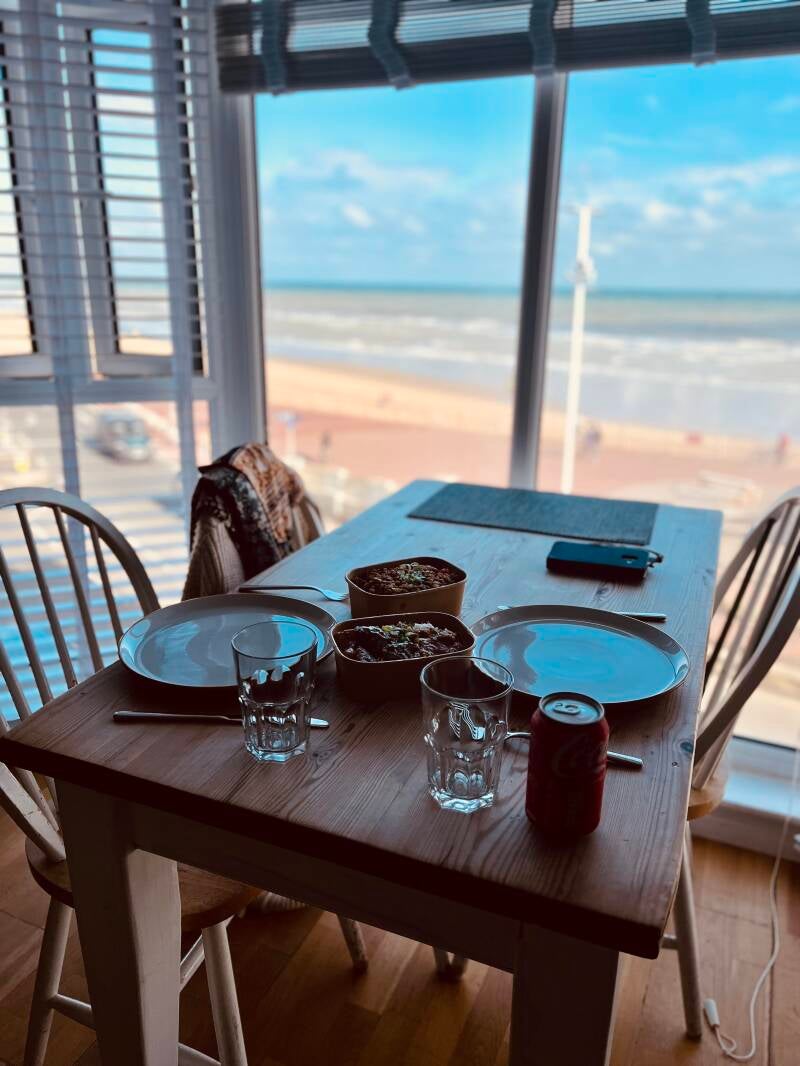 Wat gaan we doen met eten? Zullen we dat ene restaurant doen? Of die andere? We kunnen ook bij de Thai wat halen zegt mijn lief. Hij heeft in dat aparte overdekte straatje een take away gezien. Ik bedenk me dat wij in ons appartement eigenlijk de beste tafel met het beste uitzicht hebben en ik vind het een goed plan. Als we daar aankomen gaat net de hele boel op slot. Rolluiken worden neergehaald en een mevrouw zegt dat we weg moeten. Maar als we toch stiekem doorlopen zien we de deur van de Thai nog open staan. Ze hebben al opgeruimd maar als wij vragen of ze echt dicht zijn zegt hij dat ze nog wat over hebben. Hij wijst op een curry met rundvlees en op een ander gerecht. Wij vinden het helemaal top en hij gaat het voor ons warm maken en inpakken. We mogen in de hal wachten. Arjan neemt plaats op de stoeltjes aan de muur. Ik proest het uit want het beeld van die eenzame verlaten man in zijn eentje op die stoeltjes is te grappig om te zien. Ik ga maar even naast hem zitten en al snel wordt onze maaltijd gebracht. We snellen naar huis en zitten heerlijk te eten. We kijken met plezier naar alle mensen die voorbij komen met op de achtergrond die prachtige zee.