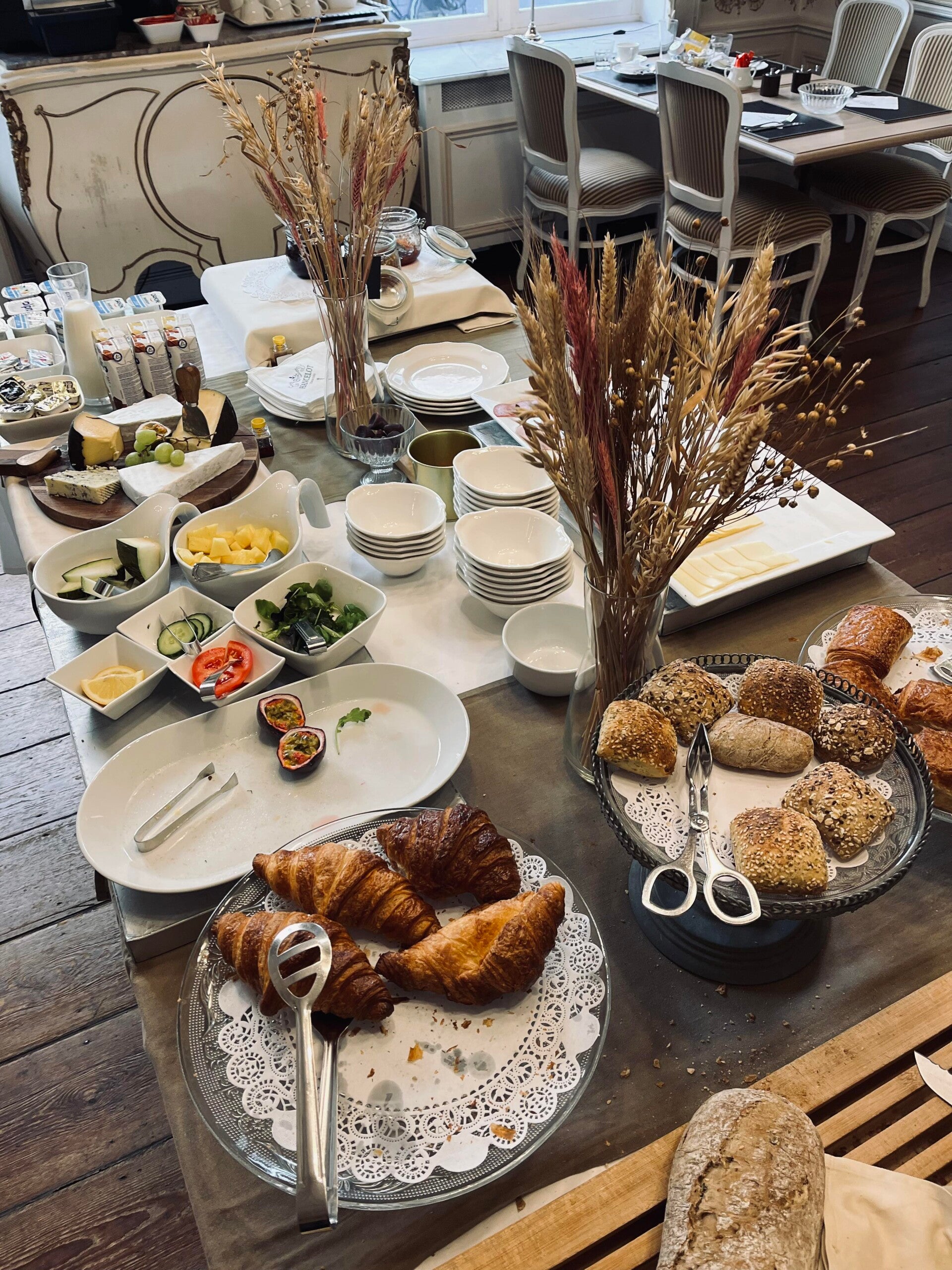 Het is ook nogal gehorig hier in het oude hotel. De houten vloeren kraken bij elke stap en ook bij de buren. We horen ze ook praten dus nemen we aan dat ze ons ook kunnen horen. Maar dat hoort nu eenmaal bij een oud gebouw vinden wij. Dan de douche. Als je er te lang onderstaat overstroomt het. En ik stond er te lang onder. Het water klotste over de bak zo de houten vloer op. Omdat het ook allemaal niet waterpas loopt stroomde het water ook onder de deur door de kamer in. Ik ben in mijn blote reet als de donder handdoeken op het water gaan leggen om erger te voorkomen. Ik ben dat even gaan melden beneden en morgenochtend zullen we merken of het probleem is opgelost. Het ontbijt is geweldig. In de prachtige ontbijtzaal stond een mooi en zeer compleet buffet (met bijpassend klassiek serviesgoed) waar we lekker van zitten te eten. We zitten bij het raam en zien dat de auto die voor onze Pierre voor de deur staat geparkeerd een bon krijgt. Ik heb net de parkeerapp geactiveerd en hoop dat het goed is gegaan. We kijken gespannen toe en dan loopt hij onze vriend voorbij. Pff gelukkig!