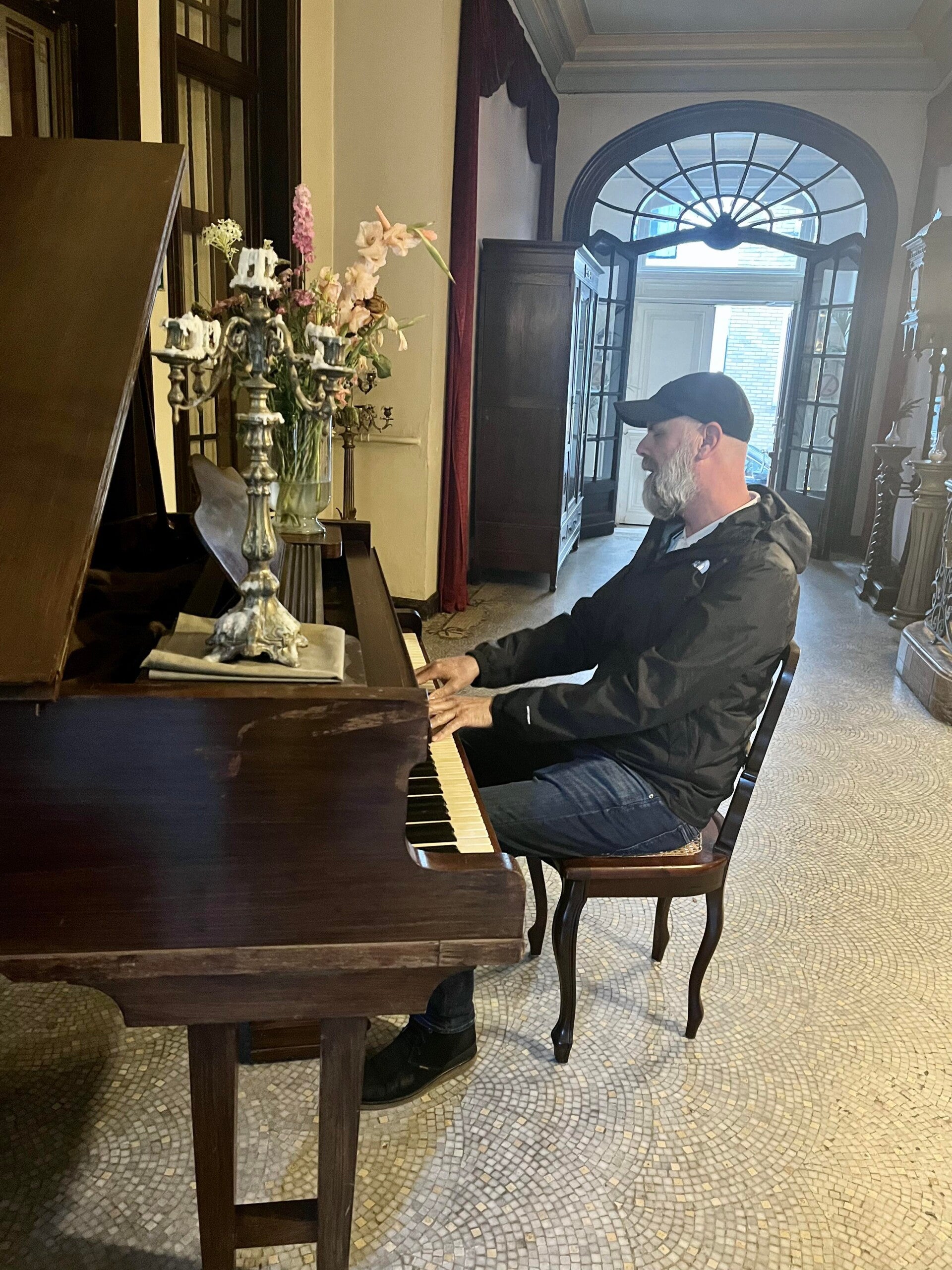 Ik maak nog even wat foto's van de mozaïekvloer voor Franca en een lachende foto in de spiegel voor Janna ;-) Arjan speelt nog even de boogie woogie op de piano en krijgt een staande ovatie.