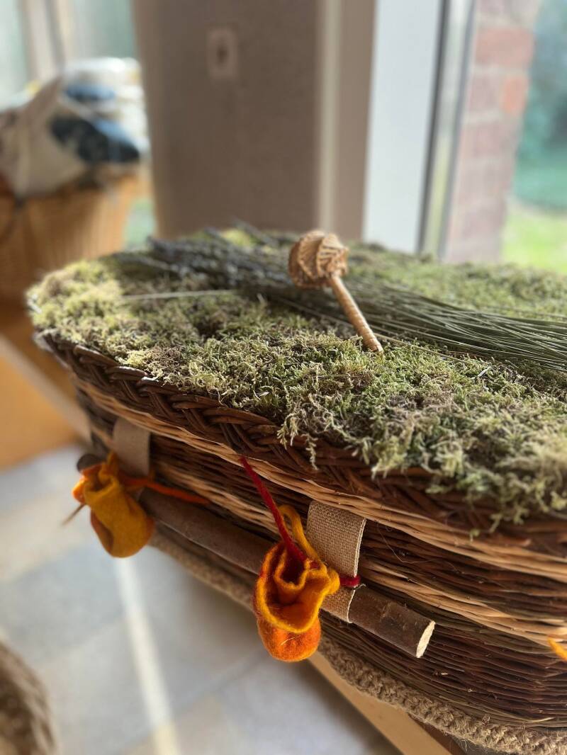 De Wilgenmanden zijn gemaakt door een echtpaar dat al lange tijd hun ambacht uitvoerden door kleine manden te vlechten. Zij kregen ooit een vraag om een uitvaart-mand te maken. Vandaag telen zij hun eigen wilgen en gaan er prat op dat alles uit Nederland moet komen. De wilgen, de wol, die bij plaatselijke boeren vandaan komt en alle materialen die gebruikt worden. Een prachtige visie en bewonderenswaardige ambacht. Ik ga persoonlijk erg goed op deze manden.